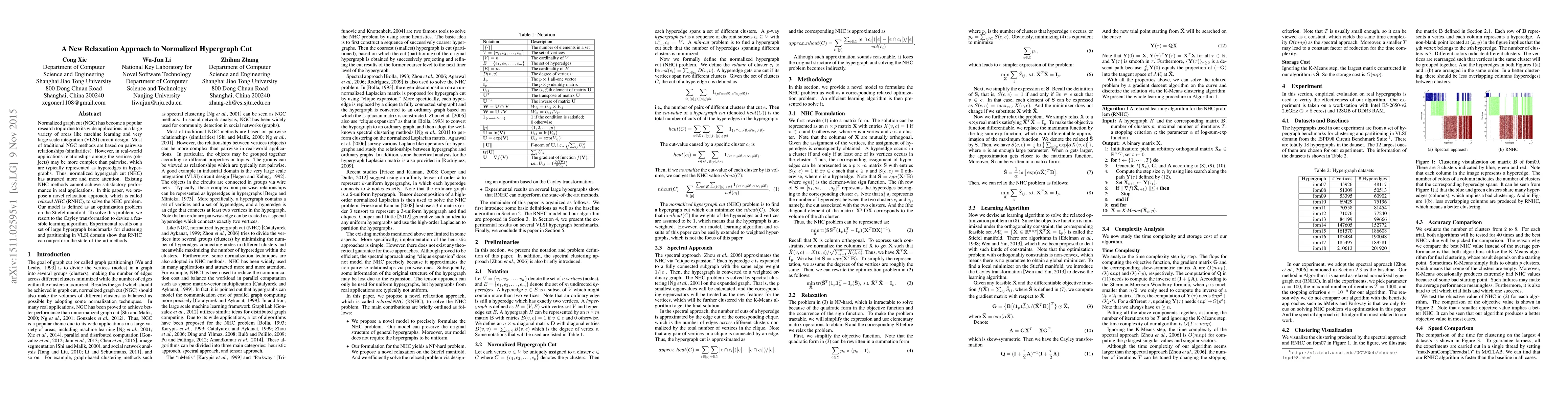 This paper introduces a novel relaxation approach called relaxed normalized hypergraph cut (RNHC) to address complex relationships among objects in hypergraphs. The proposed method optimizes on the Stiefel manifold and employs the Cayley transformation for a feasible learning algorithm, outperforming existing methods in clustering and partitioning tasks in VLSI design.