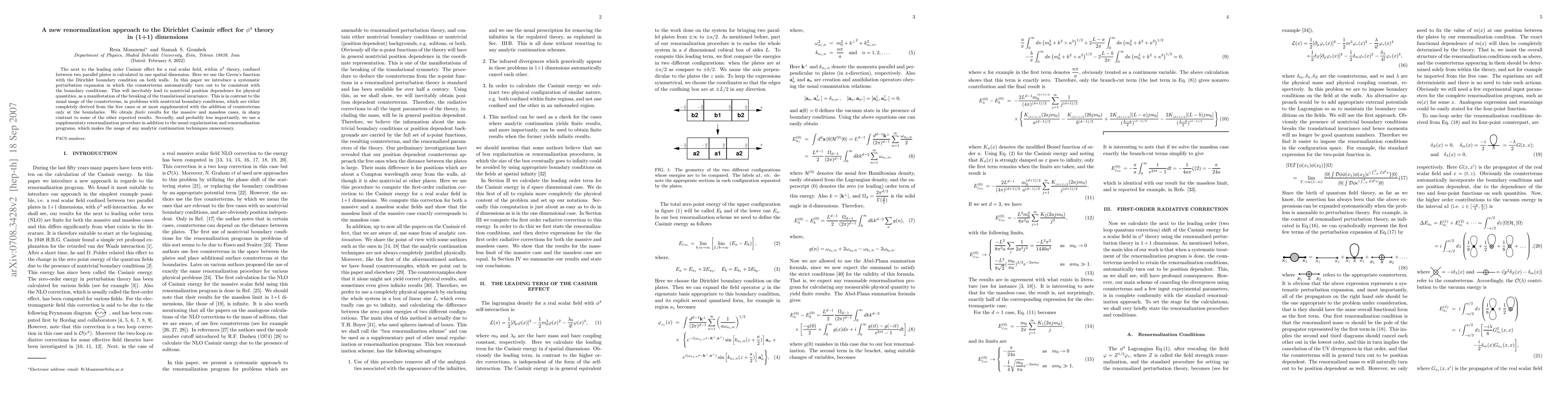 The next to the leading order Casimir effect for a real scalar field, within $\phi^4$ theory, confined between two parallel plates is calculated in one spatial dimension. Here we use the Green's function with the Dirichlet boundary condition on both walls. In this paper we introduce a systematic perturbation expansion in which the counterterms automatically turn out to be consistent with the boundary conditions. This will inevitably lead to nontrivial position dependence for physical quantities, as a manifestation of the breaking of the translational invariance. This is in contrast to the usual usage of the counterterms, in problems with nontrivial boundary conditions, which are either completely derived from the free cases or at most supplemented with the addition of counterterms only at the boundaries. We obtain \emph{finite} results for the massive and massless cases, in sharp contrast to some of the other reported results. Secondly, and probably less importantly, we use a supplementary renormalization procedure in addition to the usual regularization and renormalization programs, which makes the usage of any analytic continuation techniques unnecessary.
