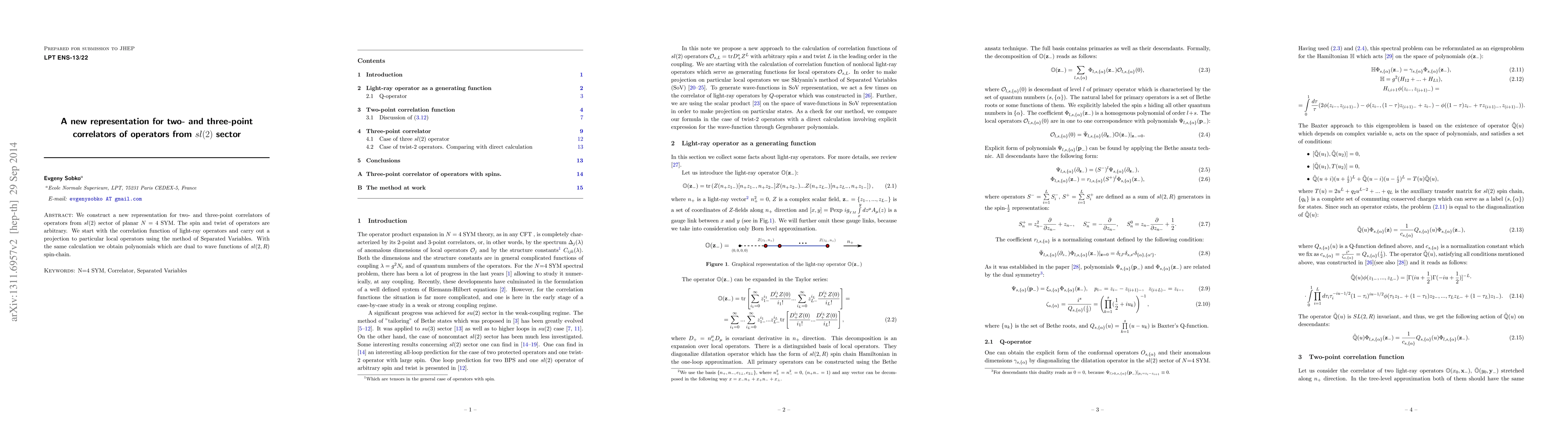 We construct a new representation for two- and three-point correlators of operators from sl(2) sector of planar N = 4 SYM. The spin and twist of operators are arbitrary. We start with the correlation function of light-ray operators and carry out a projection to particular local operators using the method of Separated Variables. With the same calculation we obtain polynomials which are dual to wave functions of sl(2,R) spin-chain.