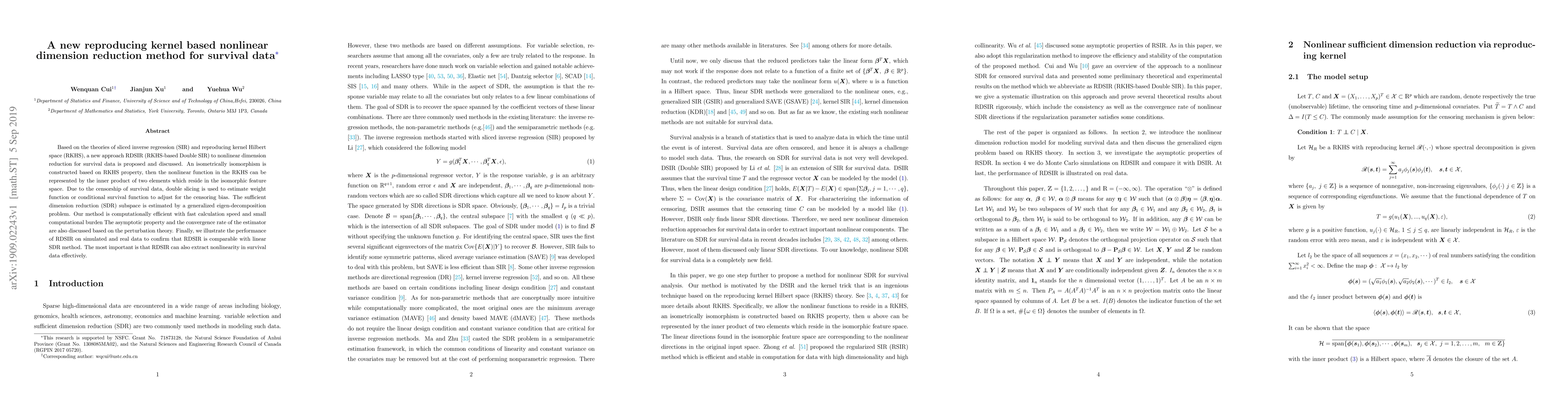 A new method called RDSIR uses a combination of sliced inverse regression and reproducing kernel Hilbert space to reduce dimensionality in survival data, offering improved performance compared to linear methods.