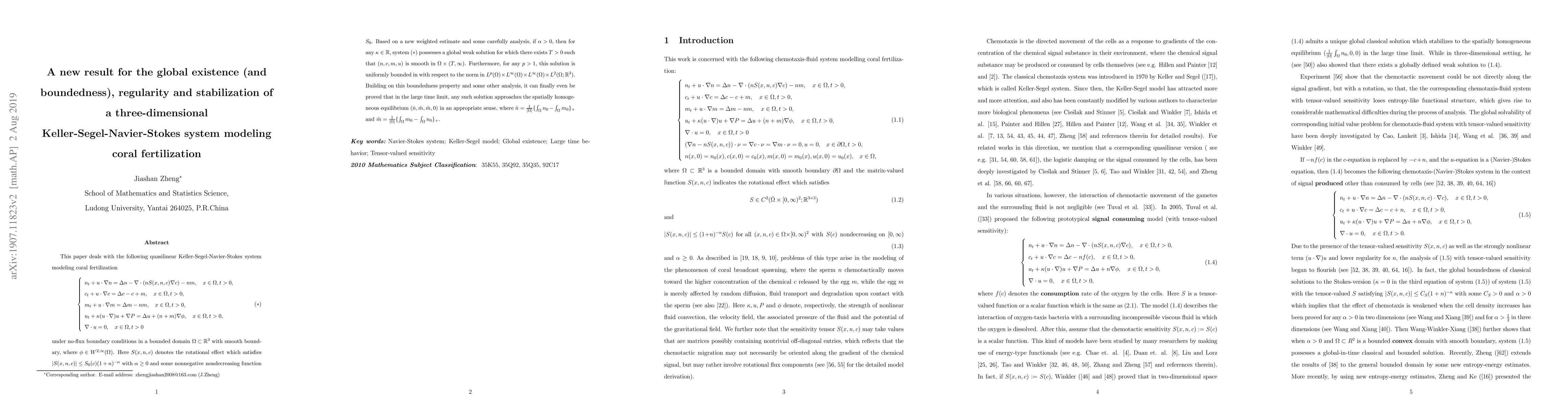 This paper establishes global existence, regularity, and stabilization for a three-dimensional Keller-Segel-Navier-Stokes system modeling coral fertilization. Under certain conditions, the system is shown to have a global weak solution that becomes smooth and remains uniformly bounded over time, eventually stabilizing to a spatially homogeneous equilibrium.