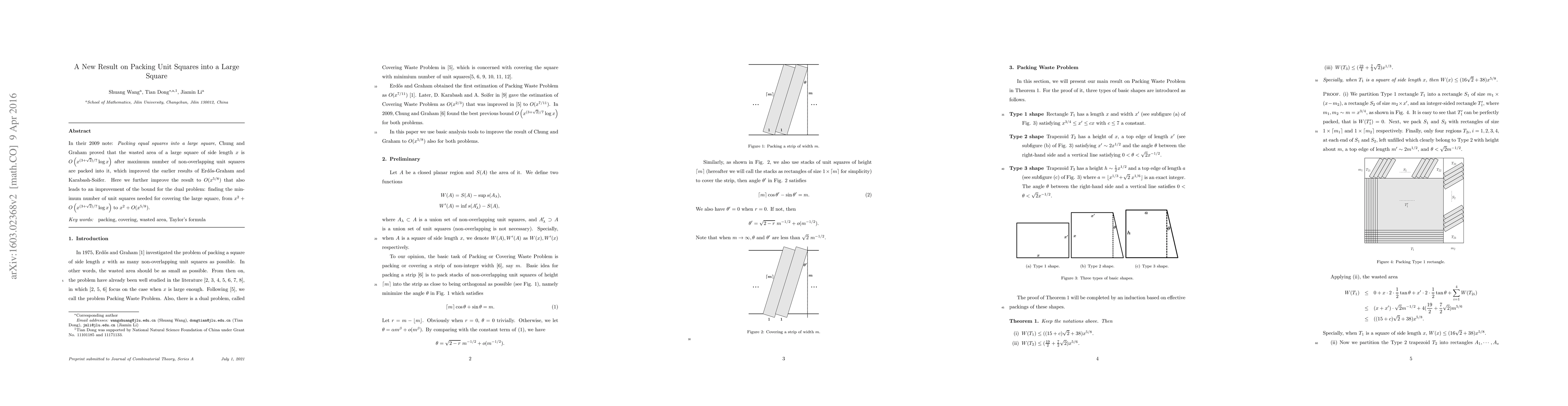 The paper builds upon previous work by Chung and Graham (2009) and improves their result on packing unit squares into a large square through a partitioning method and detailed area estimation.