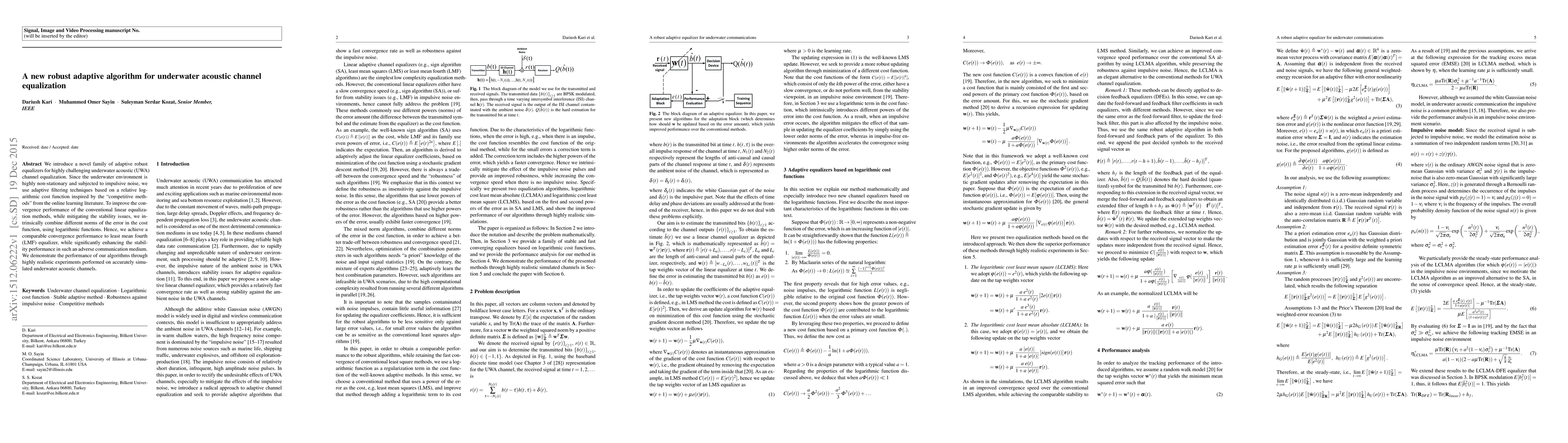 Researchers developed a new adaptive algorithm for underwater acoustic channel equalization that improves convergence performance while enhancing stability in noisy environments. Their approach combines different error norms using logarithmic functions, achieving comparable results to existing methods with better stability.