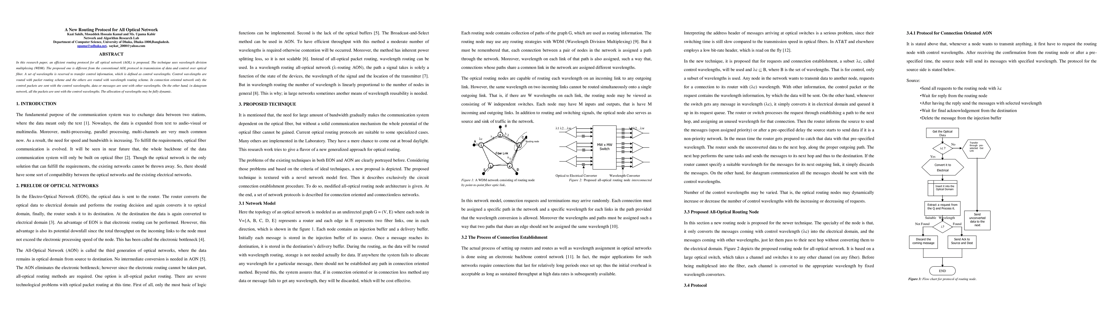 In this research paper, an efficient routing protocol for all optical network (AOL) is proposed. The technique uses wavelength division multiplexing (WDM). The proposed one is different from the conventional AOL protocol in transmission of data and control over optical fiber. A set of wavelengths is reserved to transfer control information, which is defined as control wavelengths. Control wavelengths are routed with packet routing scheme and the others are routed with wavelength routing scheme. In connection oriented network only the control packets are sent with the control wavelengths, data or messages are sent with other wavelengths. On the other hand, in datagram network, all the packets are sent with the control wavelengths. The allocation of wavelengths may be fully dynamic.