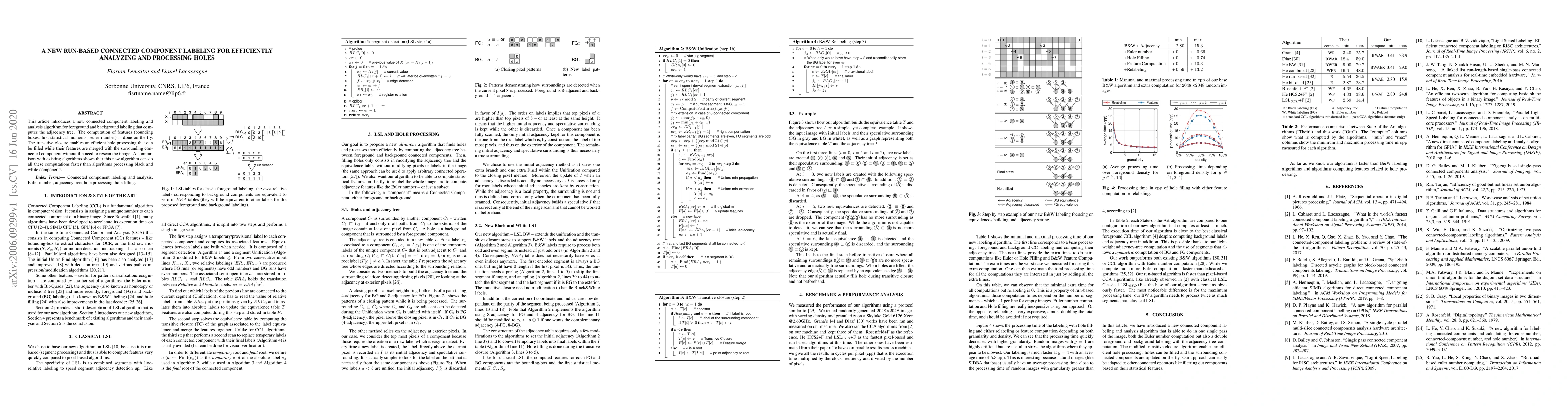 This paper presents a novel run-based connected component labeling algorithm for efficient hole analysis, performing on-the-fly feature computation and enabling faster processing compared to existing black and white component algorithms. The method utilizes transitive closure for efficient hole filling and merging without image rescanning.