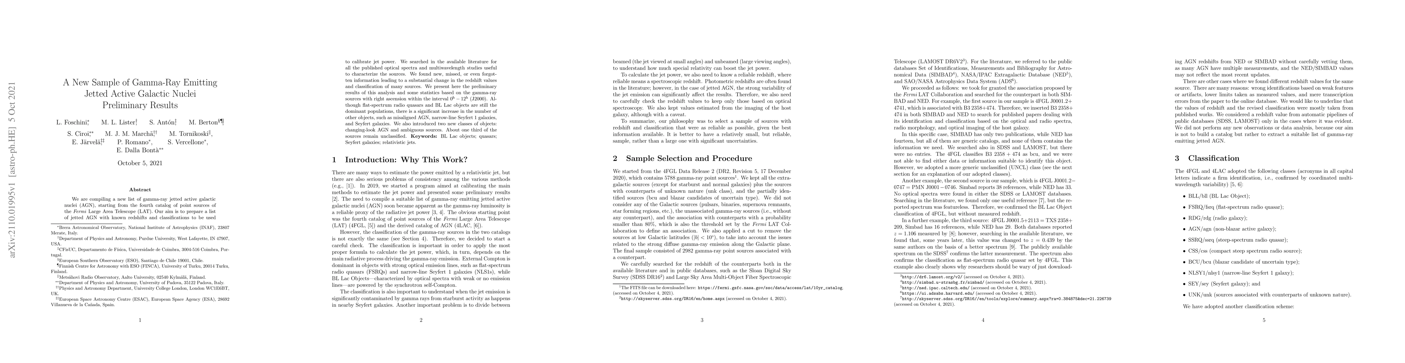 This research compiles a new catalog of gamma-ray emitting jetted active galactic nuclei (AGN) from the Fermi LAT, updating redshifts and classifications based on literature and multiwavelength studies. Preliminary results show an increased number of diverse AGN types, including misaligned AGN and new classes like changing-look AGN.