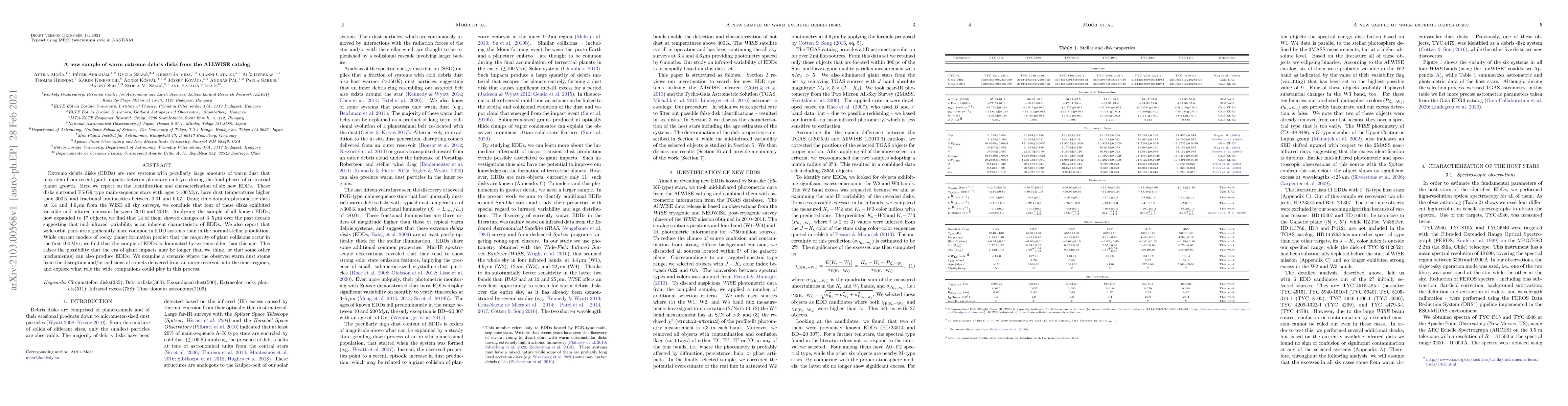 Researchers identified six new extreme debris disks around stars with recent giant impacts, found 14 of 17 known EDDs show mid-infrared variability, and discovered wide-orbit pairs in EDD systems more often than normal stellar populations.