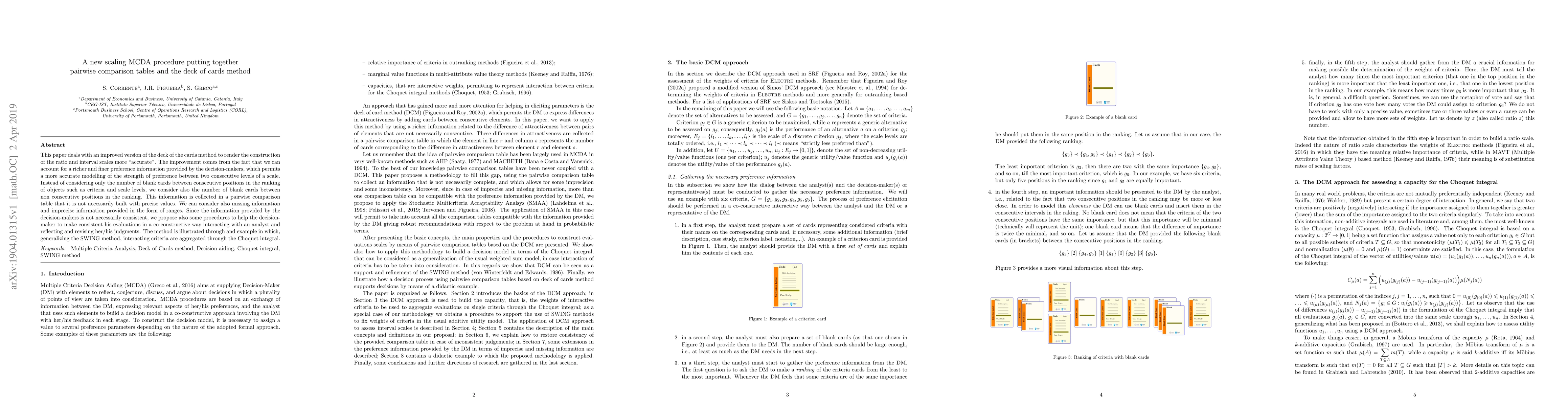 This paper introduces an enhanced deck of cards method for Multi-Criteria Decision Analysis (MCDA), incorporating pairwise comparison tables to better model preference strengths. It allows for richer preference information, including missing or imprecise data, and provides procedures for consistent evaluations. The method is demonstrated through an example using the Choquet integral for aggregated criteria.