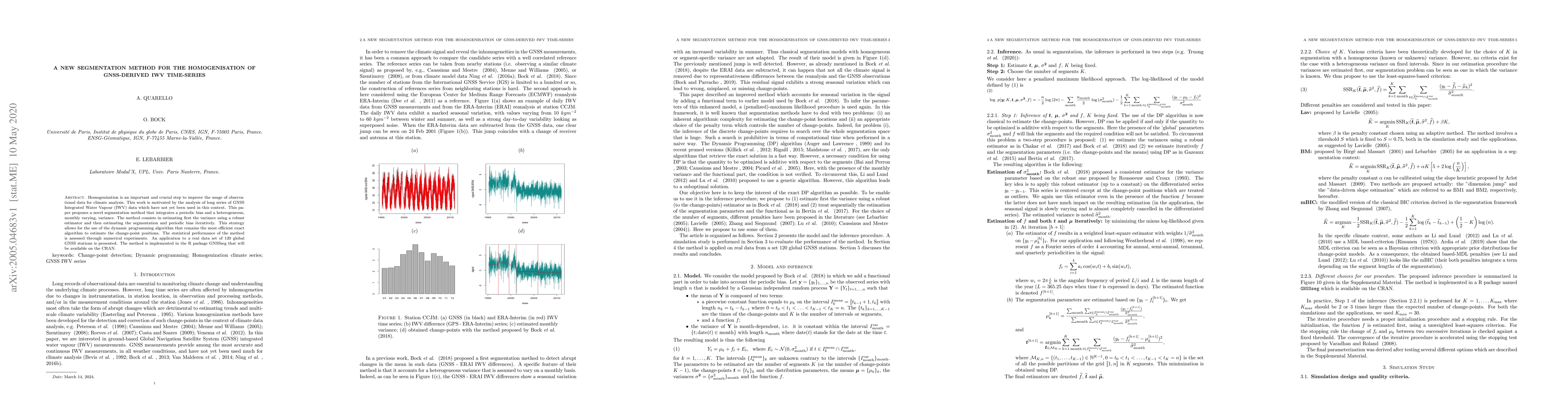 A new method for segmenting GNSS-derived IWV time-series data is proposed, allowing for accurate homogenization of climate analysis data. The method combines a robust variance estimator with dynamic programming to identify change-points in the data.