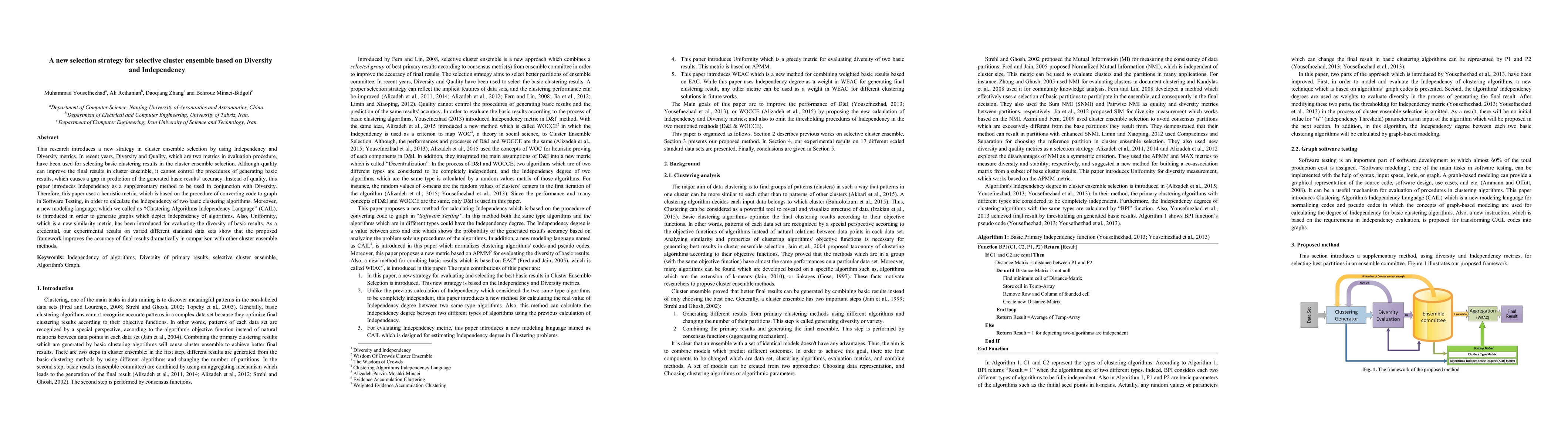 This research introduces a new strategy in cluster ensemble selection by using Independency and Diversity metrics. In recent years, Diversity and Quality, which are two metrics in evaluation procedure, have been used for selecting basic clustering results in the cluster ensemble selection. Although quality can improve the final results in cluster ensemble, it cannot control the procedures of generating basic results, which causes a gap in prediction of the generated basic results' accuracy. Instead of quality, this paper introduces Independency as a supplementary method to be used in conjunction with Diversity. Therefore, this paper uses a heuristic metric, which is based on the procedure of converting code to graph in Software Testing, in order to calculate the Independency of two basic clustering algorithms. Moreover, a new modeling language, which we called as "Clustering Algorithms Independency Language" (CAIL), is introduced in order to generate graphs which depict Independency of algorithms. Also, Uniformity, which is a new similarity metric, has been introduced for evaluating the diversity of basic results. As a credential, our experimental results on varied different standard data sets show that the proposed framework improves the accuracy of final results dramatically in comparison with other cluster ensemble methods.