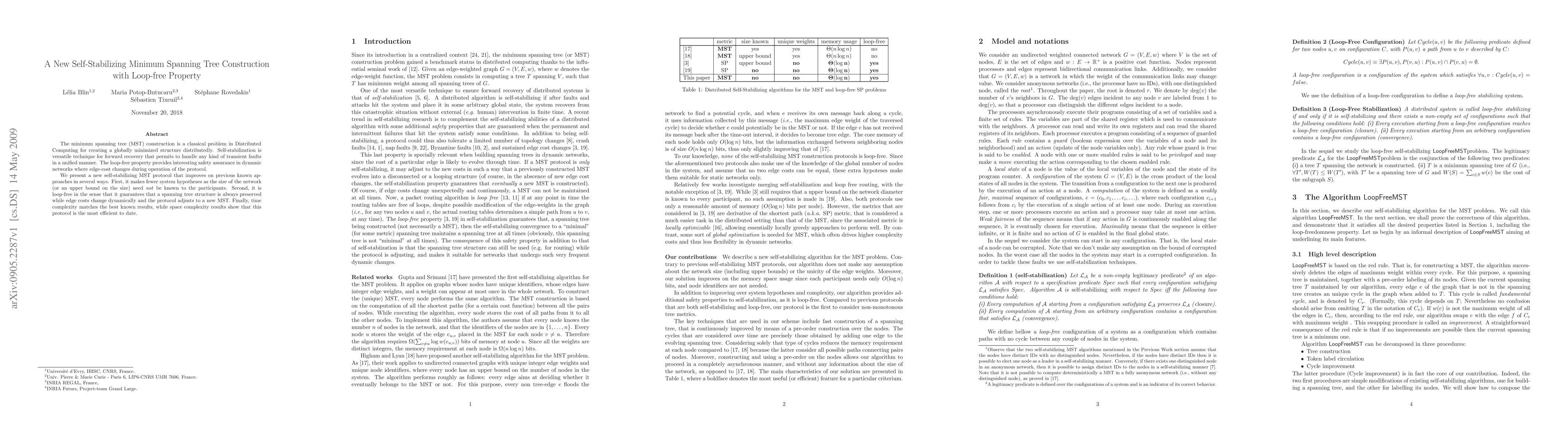This paper introduces a novel self-stabilizing minimum spanning tree (MST) construction protocol that is loop-free and requires no prior knowledge of network size. It ensures dynamic adaptation to changing edge costs while maintaining an efficient time and space complexity.