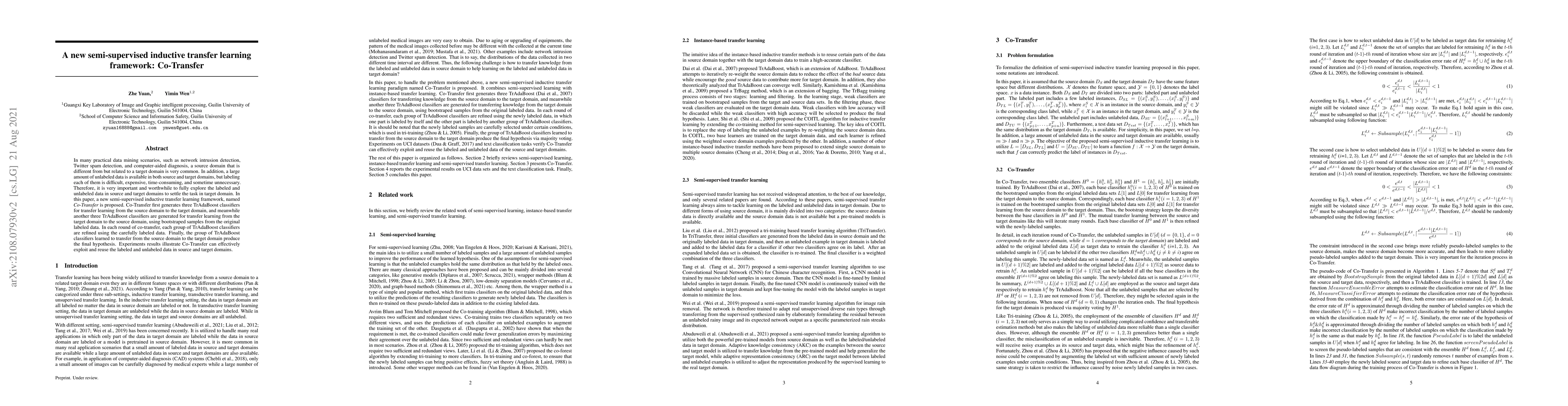 In many practical data mining scenarios, such as network intrusion detection, Twitter spam detection, and computer-aided diagnosis, a source domain that is different from but related to a target domain is very common. In addition, a large amount of unlabeled data is available in both source and target domains, but labeling each of them is difficult, expensive, time-consuming, and sometime unnecessary. Therefore, it is very important and worthwhile to fully explore the labeled and unlabeled data in source and target domains to settle the task in target domain. In this paper, a new semi-supervised inductive transfer learning framework, named Co-Transfer is proposed. Co-Transfer first generates three TrAdaBoost classifiers for transfer learning from the source domain to the target domain, and meanwhile another three TrAdaBoost classifiers are generated for transfer learning from the target domain to the source domain, using bootstraped samples from the original labeled data. In each round of co-transfer, each group of TrAdaBoost classifiers are refined using the carefully labeled data. Finally, the group of TrAdaBoost classifiers learned to transfer from the source domain to the target domain produce the final hypothesis. Experiments results illustrate Co-Transfer can effectively exploit and reuse the labeled and unlabeled data in source and target domains.