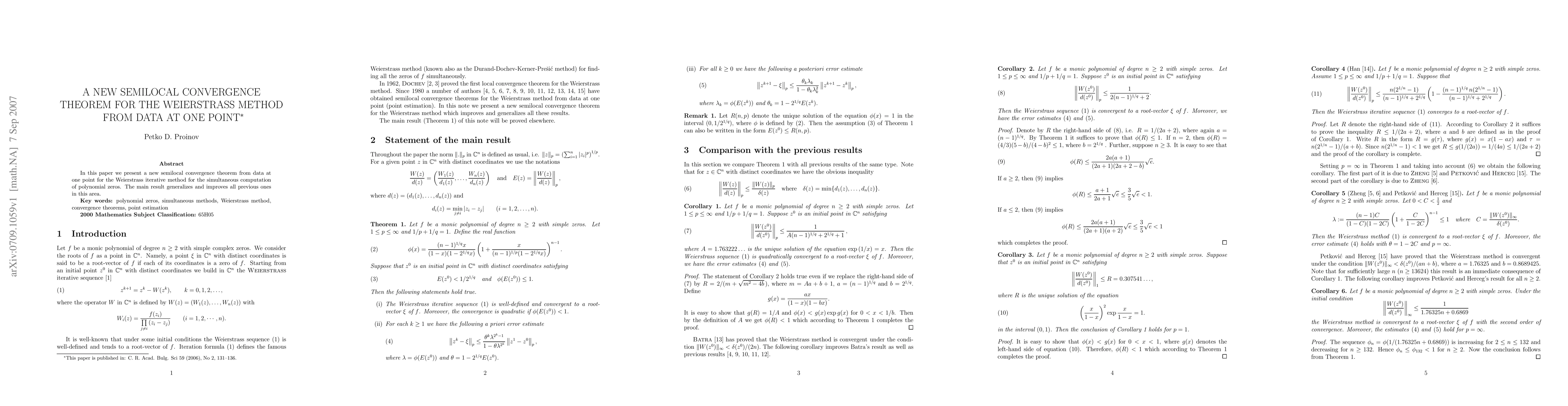 This paper introduces a new semilocal convergence theorem for the Weierstrass method, enhancing the simultaneous computation of polynomial zeros from data at a single point, and generalizes previous results in the field.