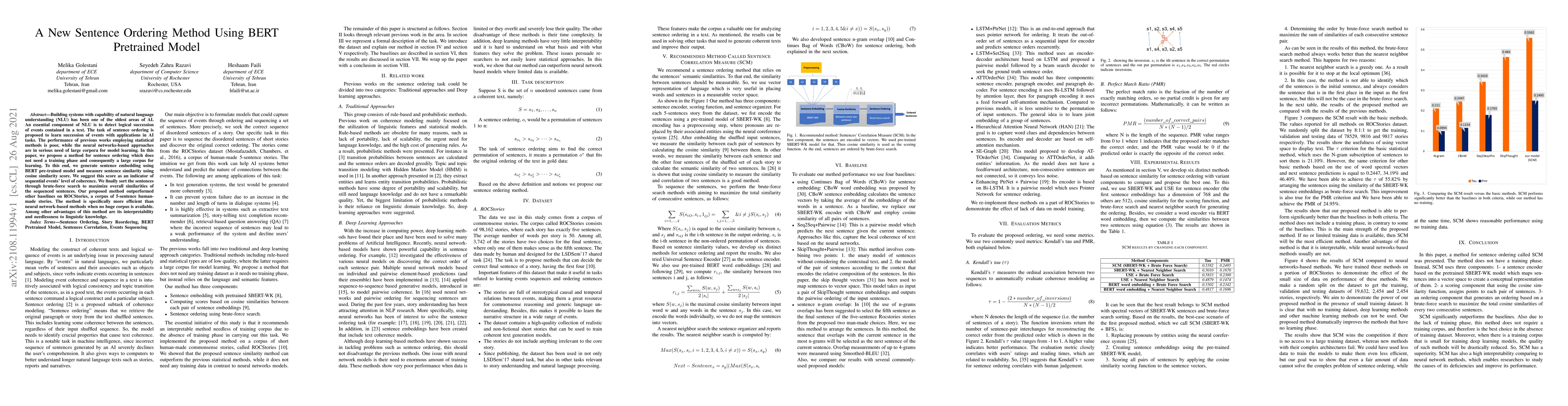 This paper proposes a sentence ordering method using BERT pre-trained embeddings to determine logical succession without requiring training or large corpora. The method sorts sentences based on cosine similarity scores, outperforming neural network-based baselines on ROCStories.