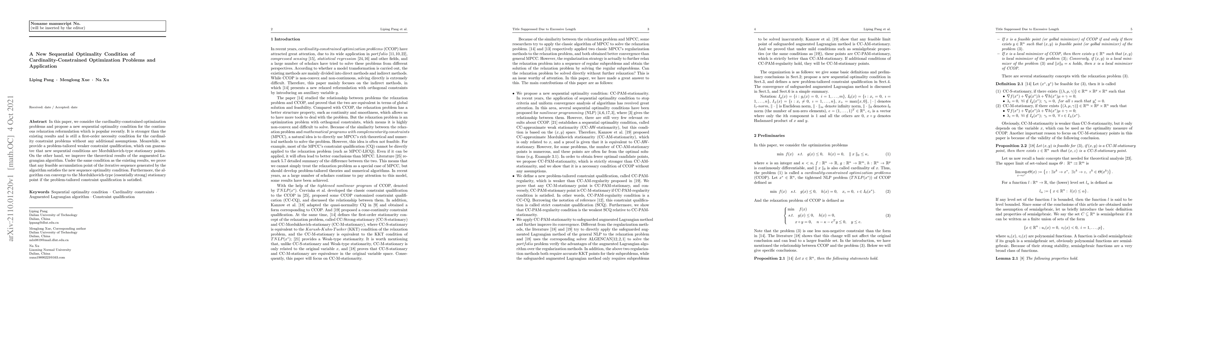 In this paper, we consider the cardinality-constrained optimization problems and propose a new sequential optimality condition for the continuous relaxation reformulation which is popular recently. It is stronger than the existing results and is still a first-order necessity condition for the cardinality constraint problems without any additional assumptions. Meanwhile, we provide a problem-tailored weaker constraint qualification, which can guarantee that new sequential conditions are Mordukhovich-type stationary points. On the other hand, we improve the theoretical results of the augmented Lagrangian algorithm. Under the same condition as the existing results, we prove that any feasible accumulation point of the iterative sequence generated by the algorithm satisfies the new sequence optimality condition. Furthermore, the algorithm can converge to the Mordukhovich-type (essentially strong) stationary point if the problem-tailored constraint qualification is satisfied.