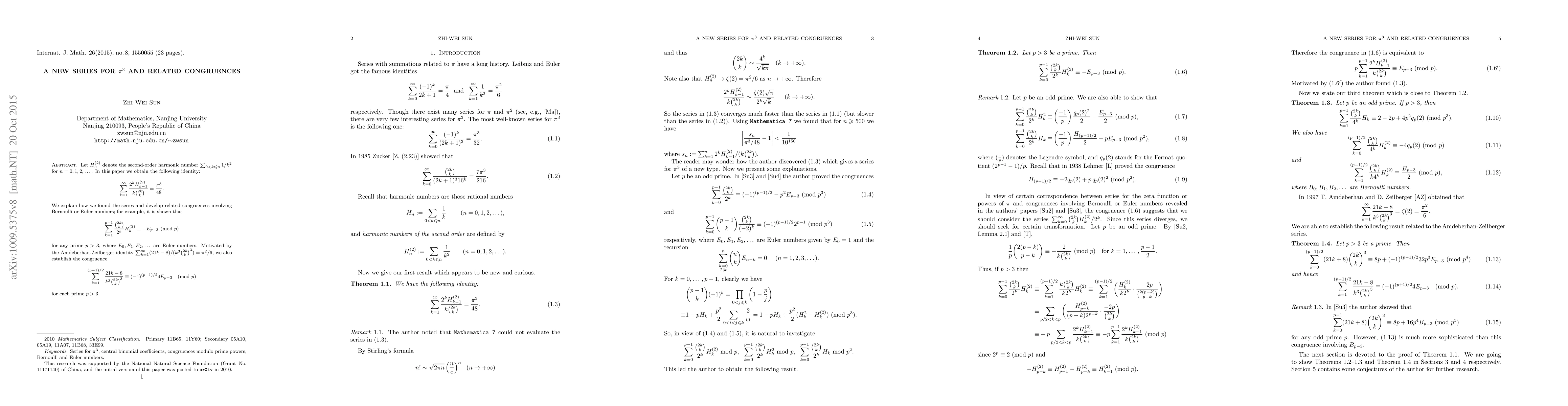 This paper presents a new series for $\pi^3$ and explores related congruences. It establishes the identity $\sum_{k=1}^\infty\frac{2^kH_{k-1}^{(2)}}{k\binom{2k}k}=\frac{\pi^3}{48}$ and develops congruences involving Bernoulli or Euler numbers, such as $\sum_{k=1}^{p-1}\frac{\binom{2k}k}{2^k}H_k^{(2)}\equiv-E_{p-3}\pmod{p}$ for primes $p>3$.