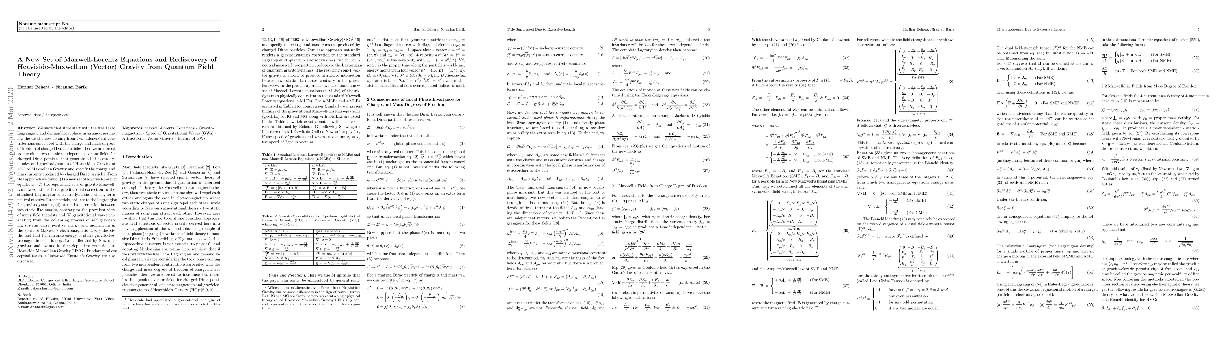 This paper proposes a new set of Maxwell-Lorentz equations derived from the free Dirac Lagrangian under local phase invariance, leading to the rediscovery of Heaviside-Maxwellian (Vector) Gravity. It introduces two massless vector fields generating electrodynamics and gravitodynamics, and discusses attractive interactions between like masses and gravitational waves carrying positive energy.