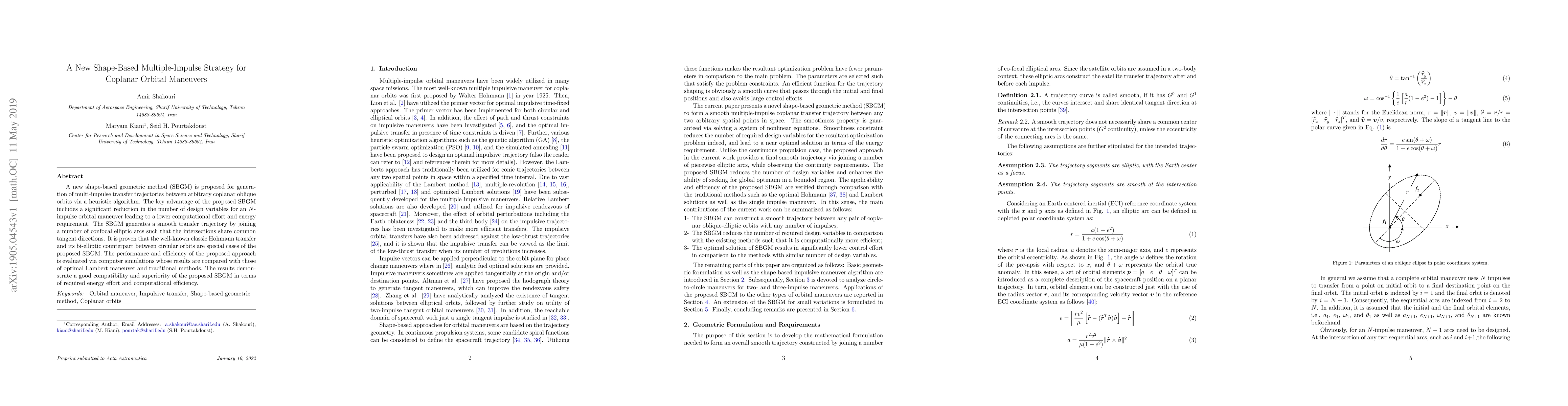 A new shape-based geometric method (SBGM) is proposed for generation of multi-impulse transfer trajectories between arbitrary coplanar oblique orbits via a heuristic algorithm. The key advantage of the proposed SBGM includes a significant reduction in the number of design variables for an N-impulse orbital maneuver leading to a lower computational effort and energy requirement. The SBGM generates a smooth transfer trajectory by joining a number of confocal elliptic arcs such that the intersections share common tangent directions. It is proven that the well-known classic Hohmann transfer and its bi-elliptic counterpart between circular orbits are special cases of the proposed SBGM. The performance and efficiency of the proposed approach is evaluated via computer simulations whose results are compared with those of optimal Lambert maneuver and traditional methods. The results demonstrate a good compatibility and superiority of the proposed SBGM in terms of required energy effort and computational efficiency.
