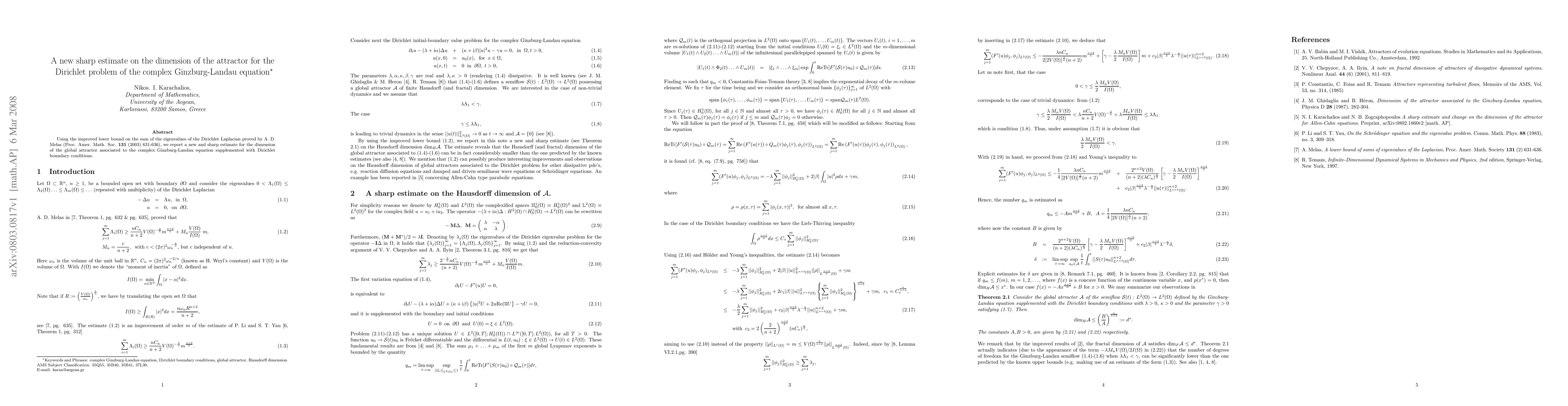 This paper presents a new, precise estimate for the dimension of the global attractor of the complex Ginzburg-Landau equation under Dirichlet boundary conditions, leveraging an improved lower bound on the sum of the Dirichlet Laplacian's eigenvalues.