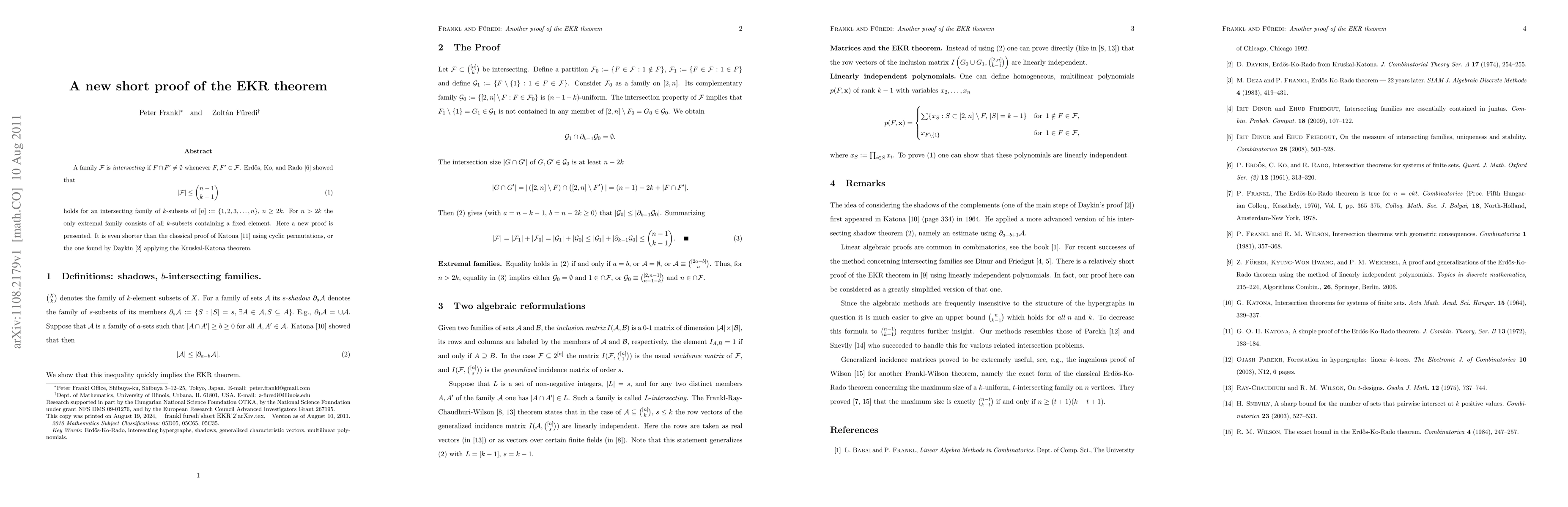 This paper presents a concise new proof for the EKR theorem, demonstrating that for intersecting families of k-subsets of [n], where n ≥ 2k, the size of the family is bounded by {n-1 choose k-1}, with the extremal case consisting of all k-subsets containing a fixed element. This proof is notably shorter than previous methods, including those by Katona and Daykin.