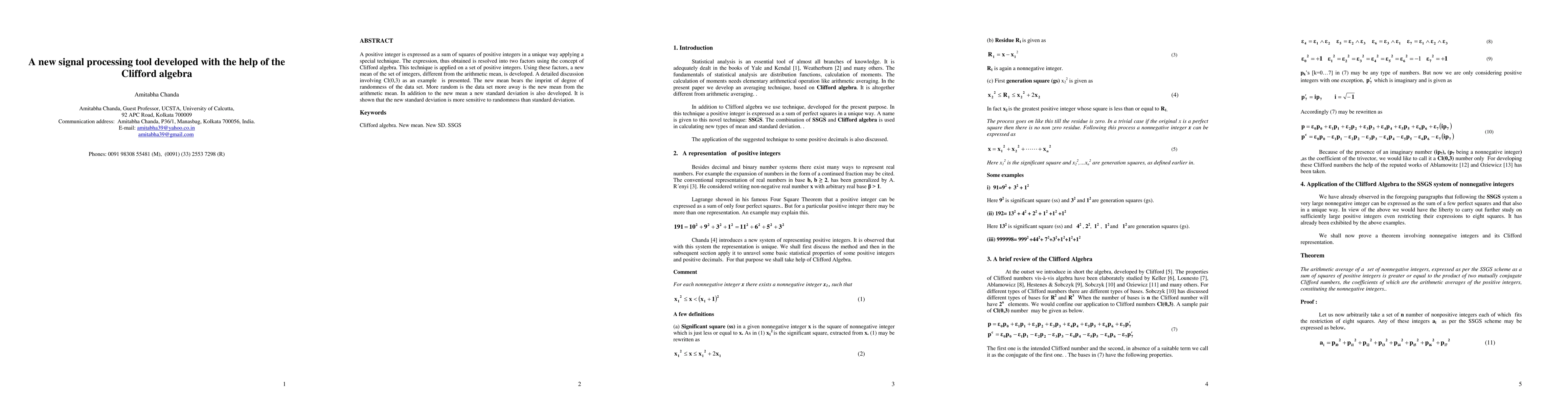 A positive integer is expressed as a sum of squares of positive integers in a unique way applying a special technique. The expression, thus obtained is resolved into two factors using the concept of the Clifford algebra. This technique is applied on a set of positive integers. Using these factors, a new mean of the set of integers, different from the arithmetic mean, is developed. A detailed discussion involving Cl(0,3) as an example is presented. The new mean bears the imprint of degree of randomness of the data set. More random is the data set more away is the new mean from the arithmetic mean. It is suggested that this averaging technique may be useful in signal and image processing with some special gain. Keywords New mean, Clifford algebra.