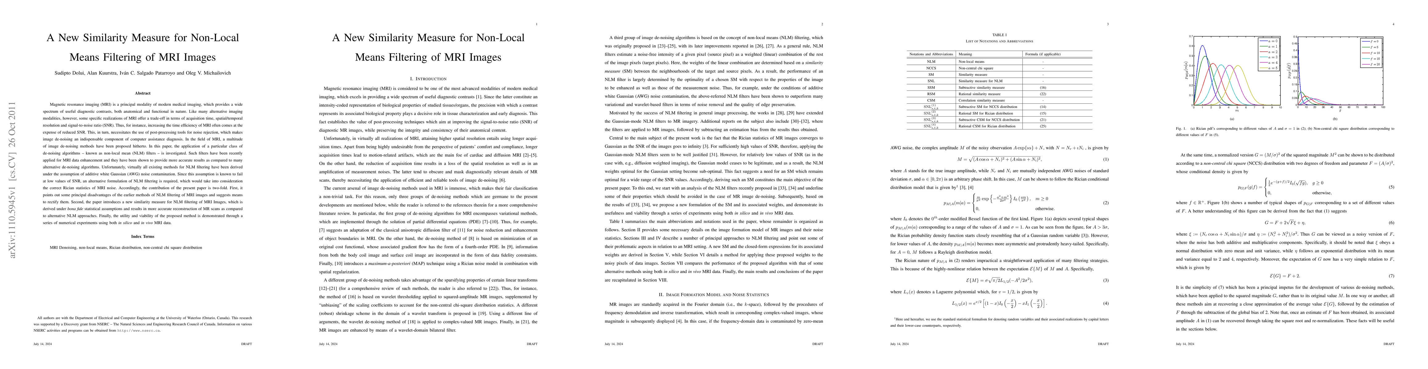 This paper proposes a new similarity measure for non-local means filtering to enhance MRI images, addressing the limitations of existing methods that assume additive white Gaussian noise. The new approach considers the Rician statistics of MRI noise, leading to more accurate image reconstruction, as demonstrated by numerical experiments.