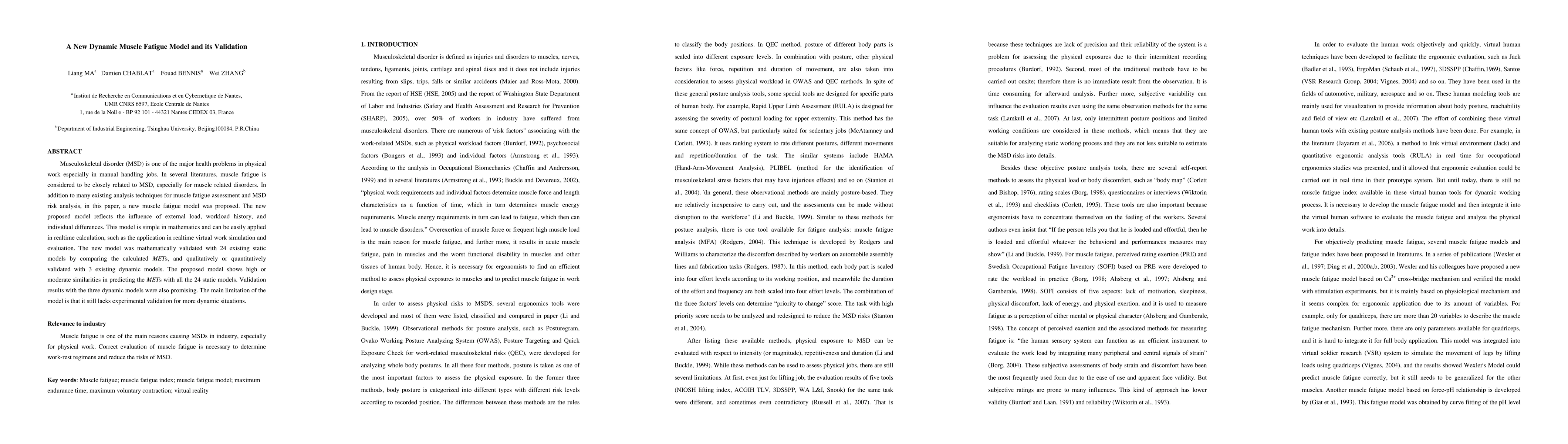This paper proposes a new, simple dynamic muscle fatigue model that considers external load, workload history, and individual differences, validated against existing static and dynamic models. While promising, the model lacks experimental validation for more dynamic scenarios, highlighting its potential for real-time applications in virtual work simulations to mitigate musculoskeletal disorders.