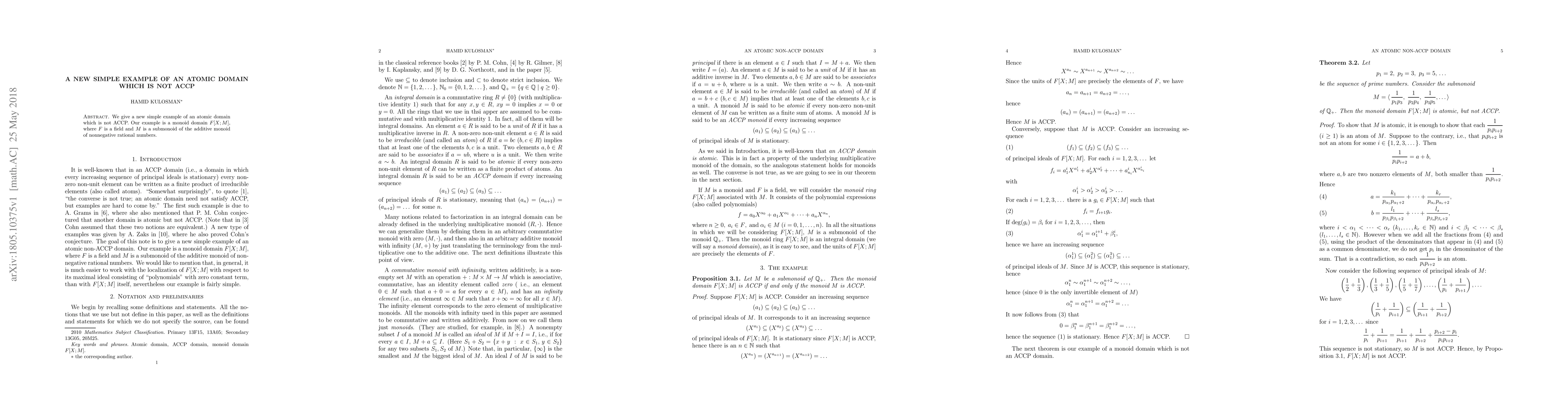 We give a new simple example of an atomic domain which is not ACCP. Our example is a monoid domain $F[X;M]$, where $F$ is a field and $M$ is a submonoid of the additive monoid of nonnegative rational numbers.