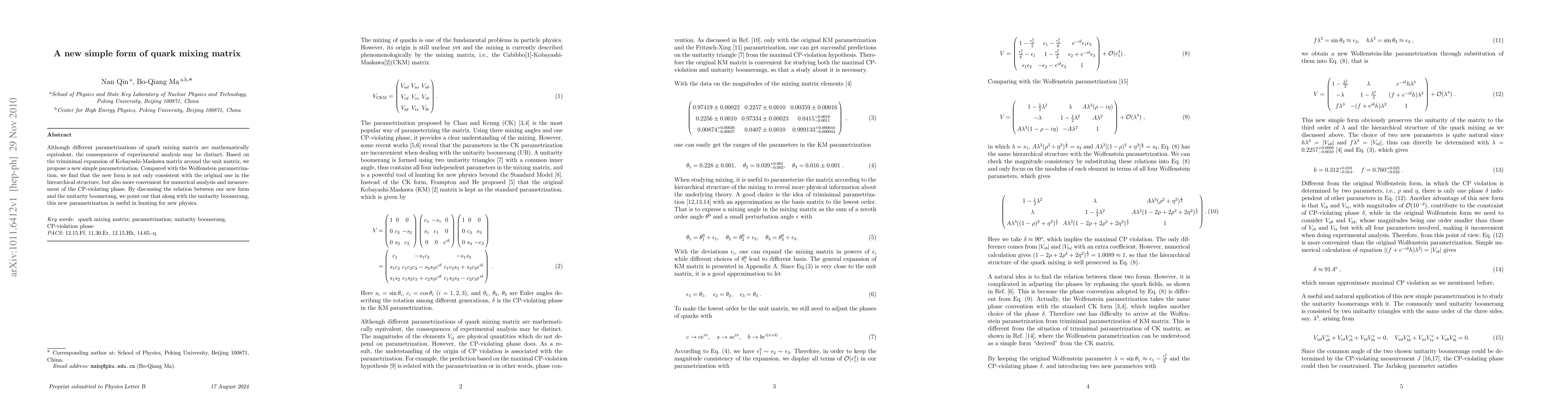 Researchers propose a new simple form of quark mixing matrix that is consistent with existing hierarchical structures and offers advantages for numerical analysis and CP-violating phase measurement.