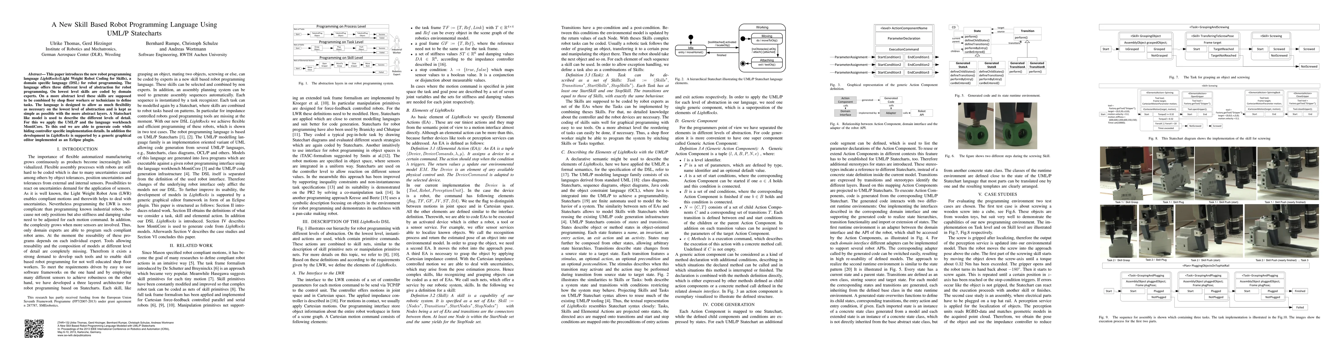 This paper introduces the new robot programming language LightRocks (Light Weight Robot Coding for Skills), a domain specific language (DSL) for robot programming. The language offers three different level of abstraction for robot programming. On lowest level skills are coded by domain experts. On a more abstract level these skills are supposed to be combined by shop floor workers or technicians to define tasks. The language is designed to allow as much flexibility as necessary on the lowest level of abstraction and is kept as simple as possible with the more abstract layers. A Statechart like model is used to describe the different levels of detail. For this we apply the UML/P and the language workbench MontiCore. To this end we are able to generate code while hiding controller specific implementation details. In addition the development in LightRocks is supported by a generic graphical editor implemented as an Eclipse plugin.