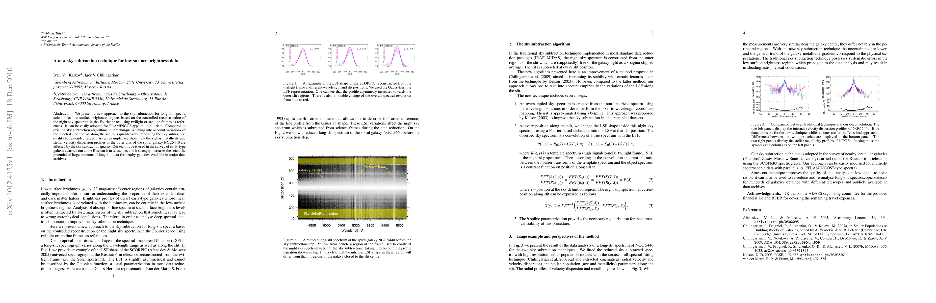 This paper introduces a novel sky subtraction technique for long-slit spectra of low-surface brightness objects, improving the method through Fourier space reconstruction and reference to twilight or arc-line frames. The technique significantly enhances the quality of sky subtraction, as demonstrated in the analysis of NGC 5440, and is applied to the survey of early-type galaxies, boosting the usability of archival data.