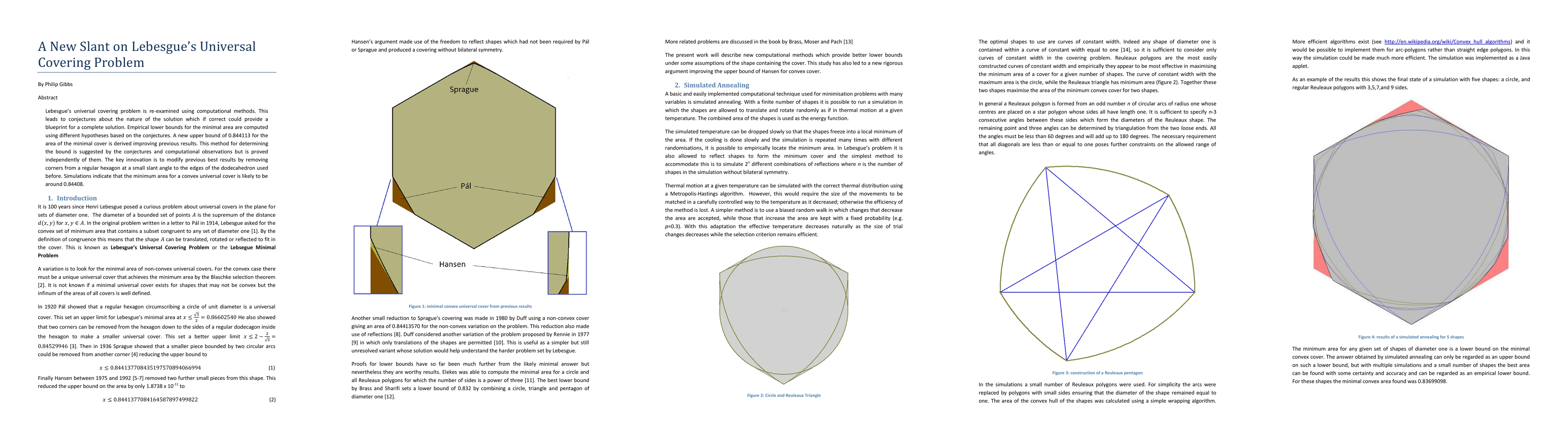 Lebesgue's universal covering problem is re-examined using computational methods. This leads to conjectures about the nature of the solution which if correct could provide a blueprint for a complete solution. Empirical lower bounds for the minimal area are computed using different hypotheses based on the conjectures. A new upper bound of 0.844113 for the area of the minimal cover is derived improving previous results. This method for determining the bound is suggested by the conjectures and computational observations but is proved independently of them. The key innovation is to modify previous best results by removing corners from a regular hexagon at a small slant angle to the edges of the dodecahedron used before. Simulations indicate that the minimum area for a convex universal cover is likely to be around 0.84408.