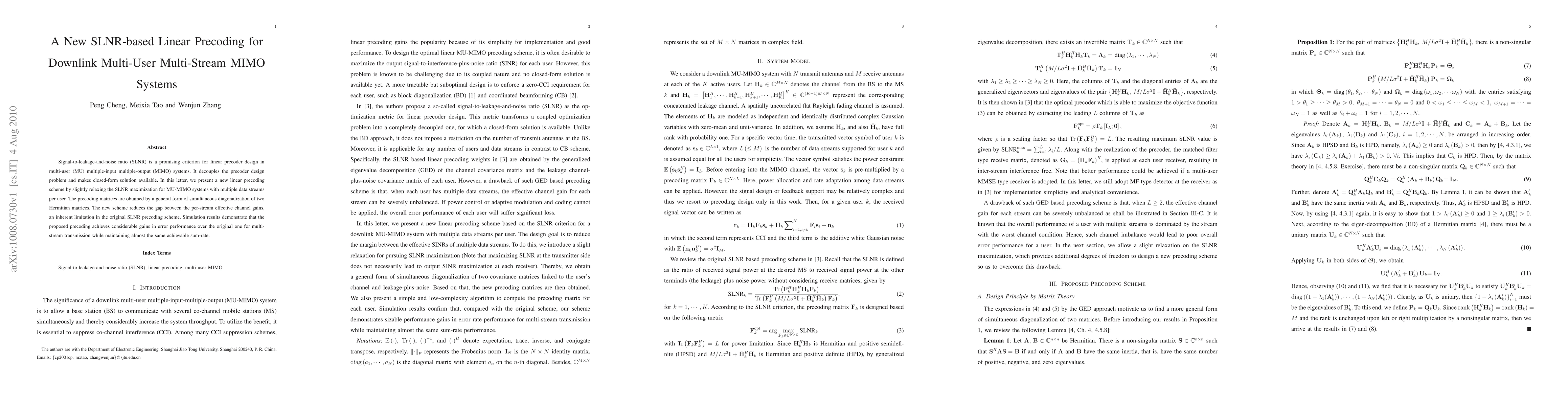 This paper proposes a new SLNR-based linear precoding scheme for downlink multi-user MIMO systems, which relaxes SLNR maximization to reduce the gap in per-stream effective channel gains. The scheme achieves better error performance with nearly the same sum-rate compared to the original SLNR precoding.