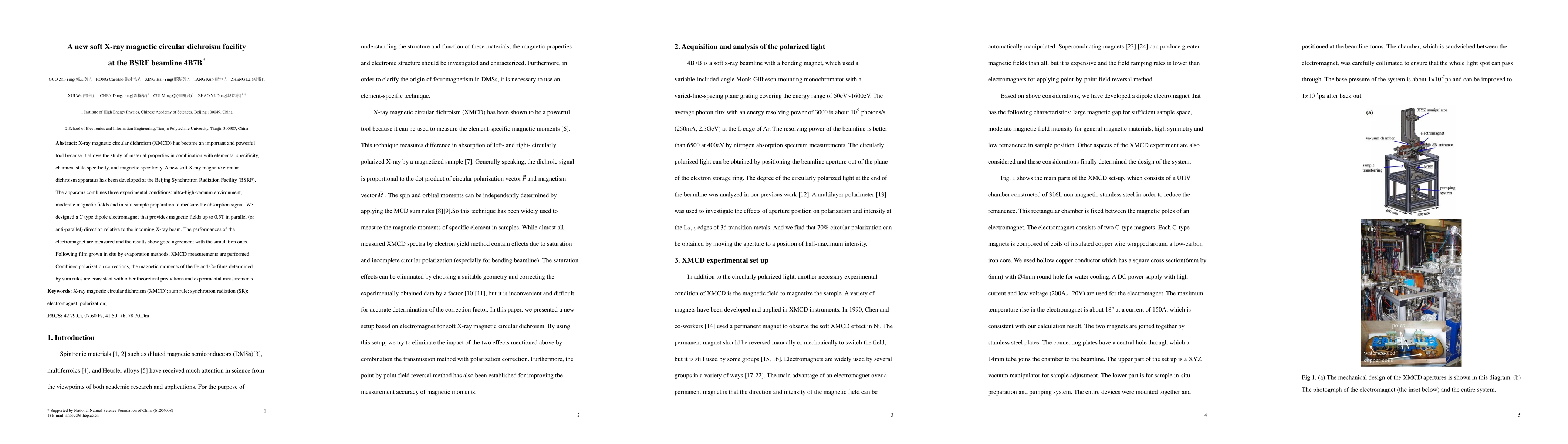A new soft X-ray magnetic circular dichroism facility at BSRF's beamline 4B7B has been developed, combining ultra-high-vacuum, moderate magnetic fields, and in-situ sample preparation for precise material property studies. The facility's C type dipole electromagnet successfully generates up to 0.5T magnetic fields, with accurate performance validated through XMCD measurements of Fe and Co films.
