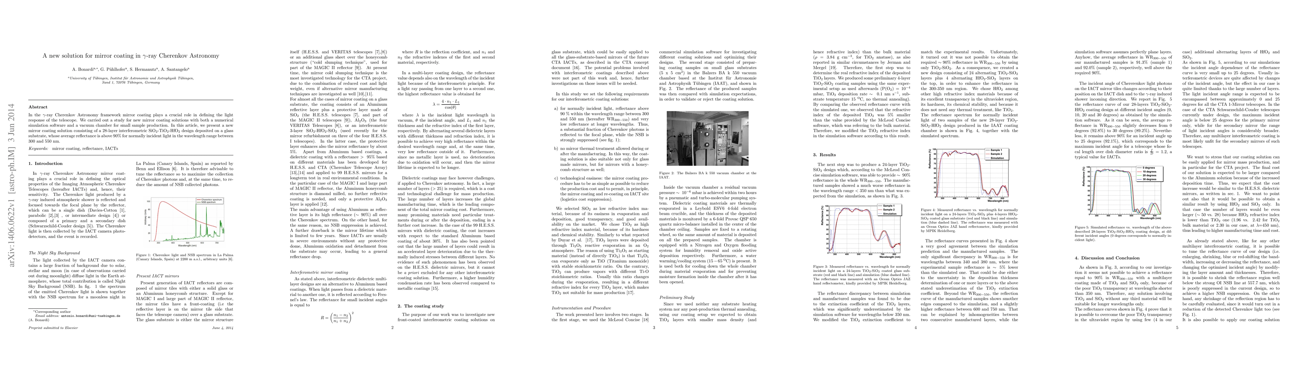 In the $\gamma$-ray Cherenkov Astronomy framework mirror coating plays a crucial role in defining the light response of the telescope. We carried out a study for new mirror coating solutions with both a numerical simulation software and a vacuum chamber for small sample production. In this article, we present a new mirror coating solution consisting of a 28-layer interferometric SiO$_{2}$-TiO$_{2}$-HfO$_{2}$ design deposited on a glass substrate, whose average reflectance is above $90\%$ for normally incident light in the wavelength range between 300 and 550 nm.