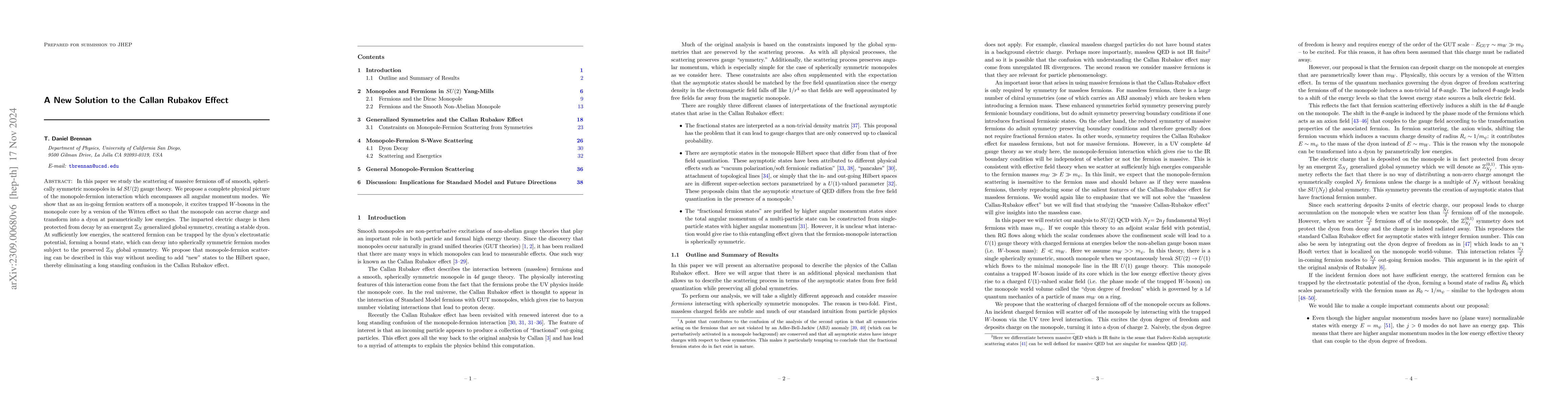 In this paper we study the scattering of massive fermions off of smooth, spherically symmetric monopoles in $4d$ $SU(2)$ gauge theory. We propose a complete physical picture of the monopole-fermion interaction which encompasses all angular momentum modes. We show that as an in-going fermion scatters off a monopole, it excites trapped $W$-bosons in the monopole core by a version of the Witten effect so that the monopole can accrue charge and transform into a dyon at parametrically low energies. The imparted electric charge is then protected from decay by an emergent $\mathbb{Z}_N$ generalized global symmetry, creating a stable dyon. At sufficiently low energies, the scattered fermion can be trapped by the dyon's electrostatic potential, forming a bound state, which can decay into spherically symmetric fermion modes subject to the preserved $\mathbb{Z}_N$ global symmetry. We propose that monopole-fermion scattering can be described in this way without needing to add ``new'' states to the Hilbert space, thereby eliminating a long standing confusion in the Callan Rubakov effect.