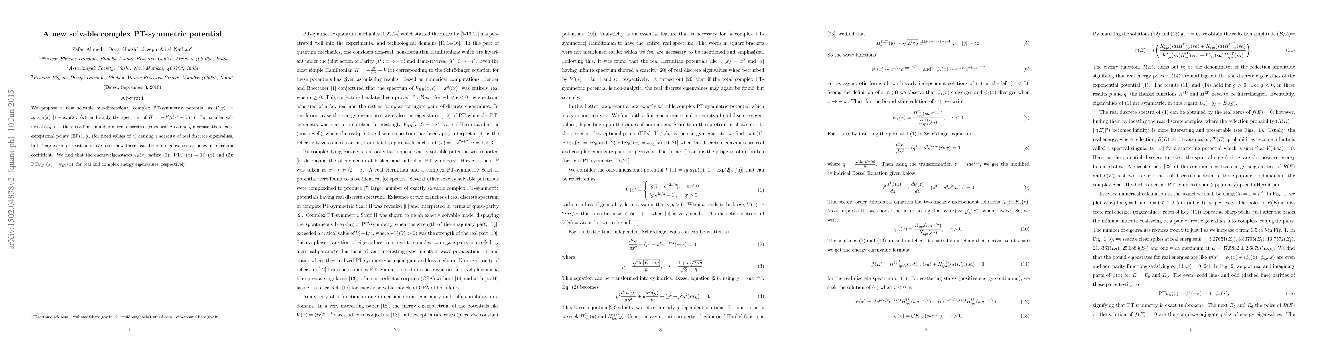 Researchers propose a new one-dimensional complex PT-symmetric potential with solvable eigenvalues that exhibit real discrete energy states for certain parameters, leading to poles in the reflection coefficient.