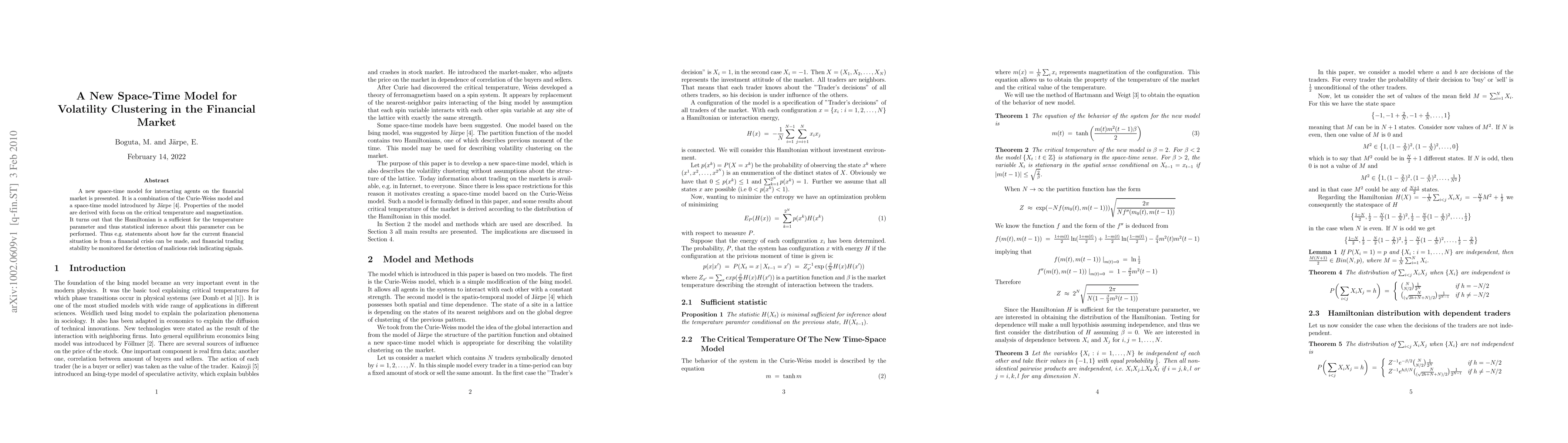 A new space-time model for financial market volatility clustering is proposed, enabling analysis of critical temperature and magnetization to predict financial stability and detect malicious risk signals.