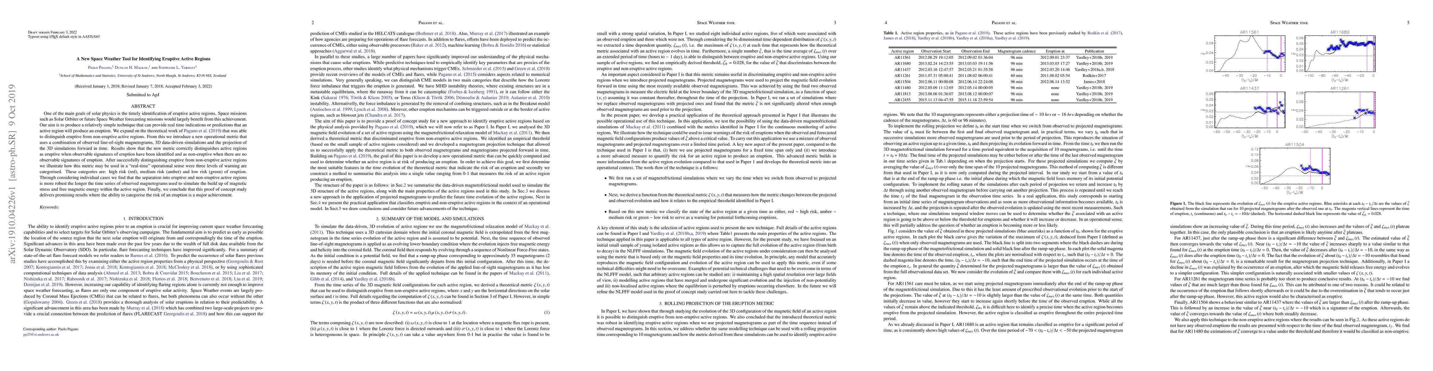 This paper presents a new space weather tool that identifies eruptive active regions using a combination of magnetograms, 3D simulations, and real-time projections. The proposed metric categorizes regions into high, medium, and low risk of eruption, showing promising results for real-time space weather forecasting.