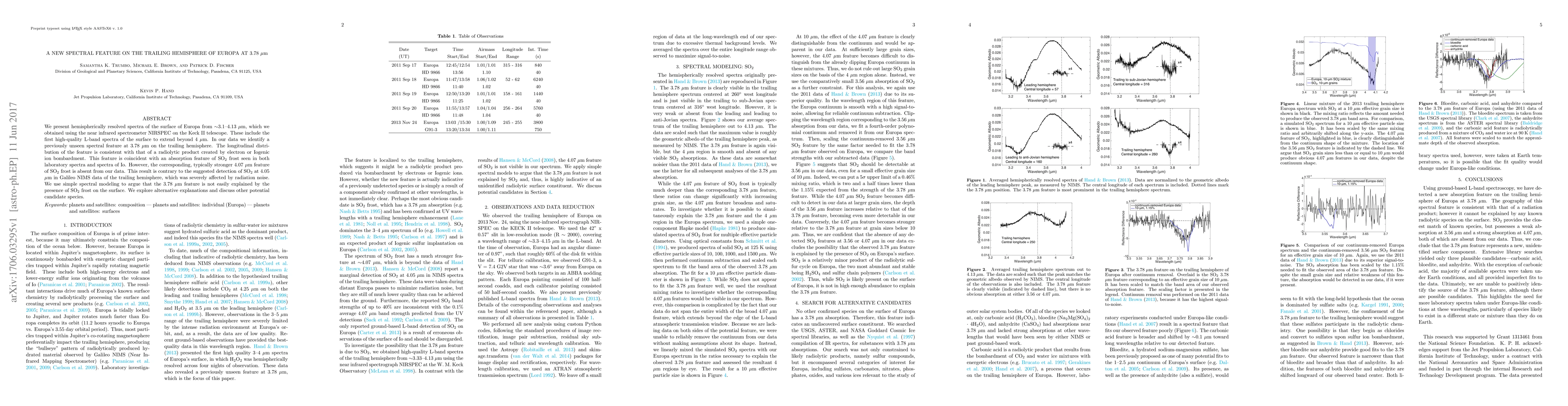 New spectral feature detected at 3.78 microns on Europa's trailing hemisphere, suggesting radiolytic product created by electron or Iogenic ion bombardment.