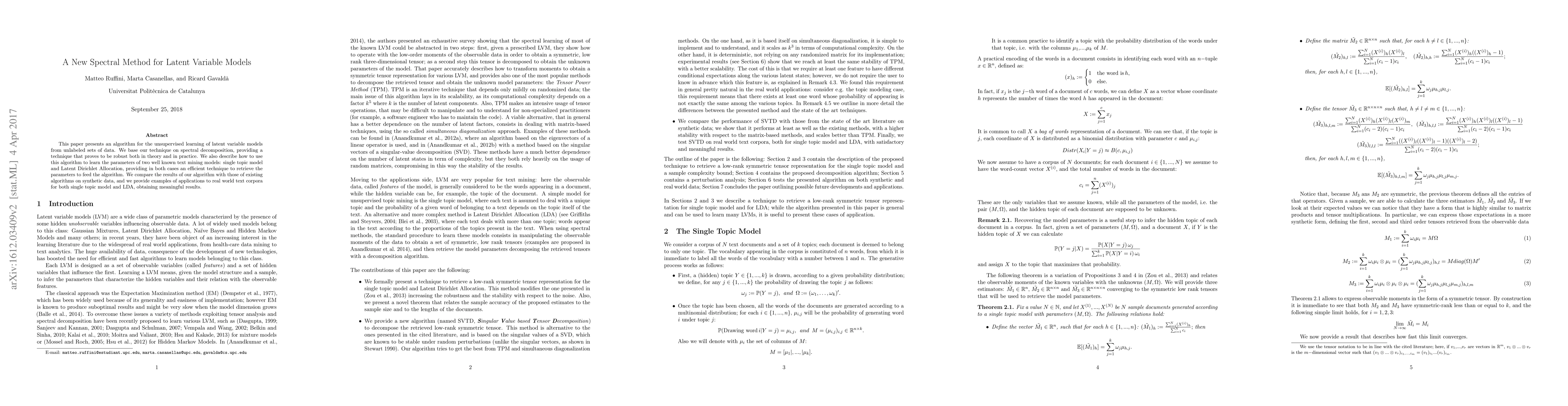 This paper presents an algorithm for the unsupervised learning of latent variable models from unlabeled sets of data. We base our technique on spectral decomposition, providing a technique that proves to be robust both in theory and in practice. We also describe how to use this algorithm to learn the parameters of two well known text mining models: single topic model and Latent Dirichlet Allocation, providing in both cases an efficient technique to retrieve the parameters to feed the algorithm. We compare the results of our algorithm with those of existing algorithms on synthetic data, and we provide examples of applications to real world text corpora for both single topic model and LDA, obtaining meaningful results.