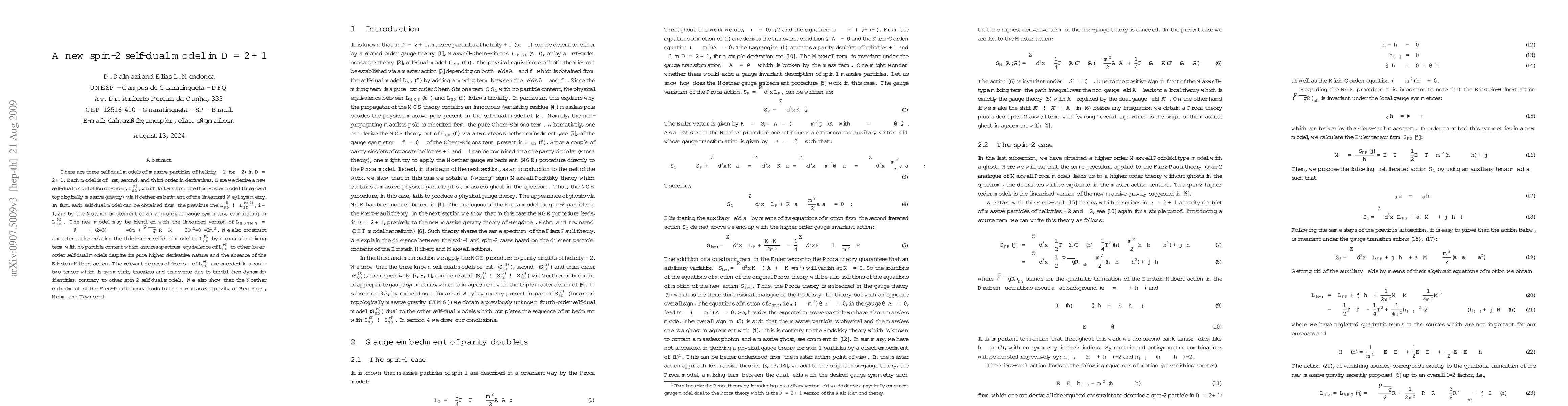 There are three self-dual models of massive particles of helicity +2 (or -2) in $D=2+1$. Each model is of first, second, and third-order in derivatives. Here we derive a new self-dual model of fourth-order, $\cL {SD}^{(4)}$, which follows from the third-order model (linearized topologically massive gravity) via Noether embedment of the linearized Weyl symmetry. In fact, each self-dual model can be obtained from the previous one $ \cL {SD}^{(i)} \to \cL {SD}^{(i+1)}, i=1,2,3$ by the Noether embedment of an appropriate gauge symmetry, culminating in $\cL {SD}^{(4)}$. The new model may be identified with the linearized version of $\cL {HDTMG} = \epsilon^{\mu\nu\rho} \Gamma_{\mu\gamma}^\epsilon (\p_\nu\Gamma_{\epsilon\rho}^\gamma + (2/3)\Gamma_{\nu\delta}^\gamma \Gamma_{\rho\epsilon}^\delta) /8 m + \sqrt{-g}(R_{\mu\nu} R^{\nu\mu} - 3 R^2/8) /2 m^2 $. We also construct a master action relating the third-order self-dual model to $\cL {SD}^{(4)}$ by means of a mixing term with no particle content which assures spectrum equivalence of $\cL {SD}^{(4)}$ to other lower-order self-dual models despite its pure higher derivative nature and the absence of the Einstein-Hilbert action. The relevant degrees of freedom of $\cL {SD}^{(4)}$ are encoded in a rank-two tensor which is symmetric, traceless and transverse due to trivial (non-dynamic) identities, contrary to other spin-2 self-dual models. We also show that the Noether embedment of the Fierz-Pauli theory leads to the new massive gravity of Bergshoeff, Hohm and Townsend.