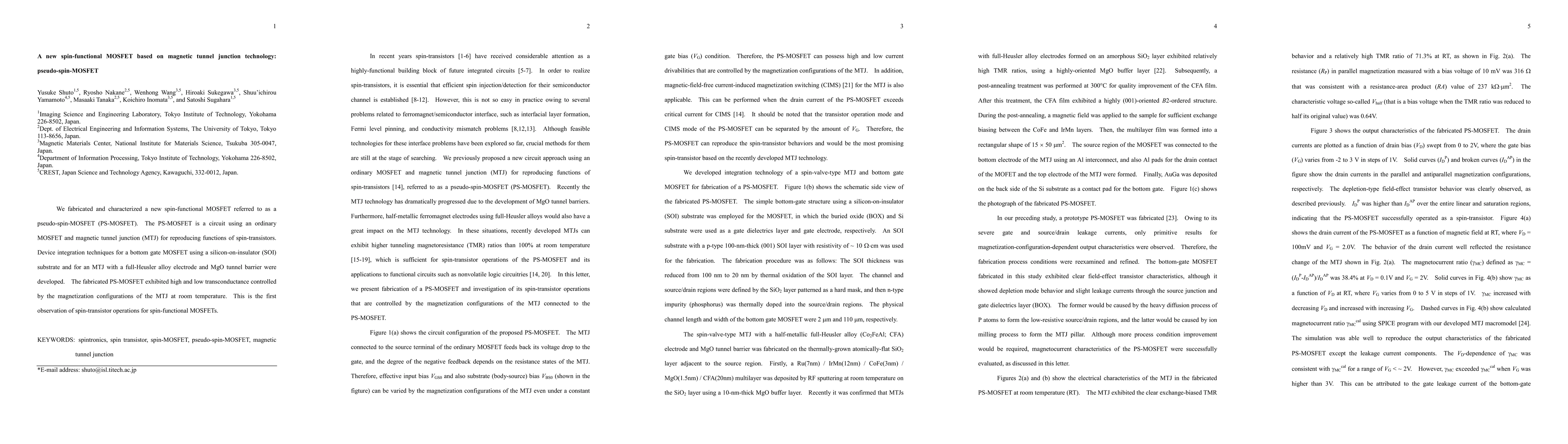 This paper reports on the fabrication and characterization of a novel pseudo-spin-MOSFET (PS-MOSFET) combining an ordinary MOSFET with a magnetic tunnel junction (MTJ). The PS-MOSFET demonstrates room-temperature spin-transistor operations with high and low transconductance controlled by MTJ magnetization, marking the first instance of such functionality in spin-functional MOSFETs.