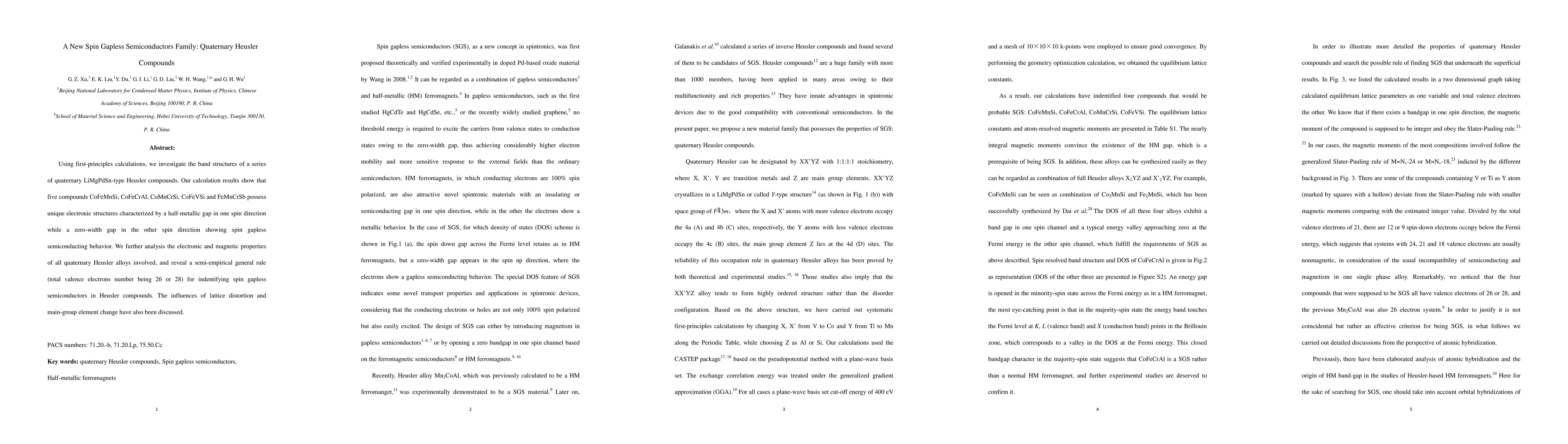 This study identifies five quaternary LiMgPdSn-type Heusler compounds exhibiting spin gapless semiconducting behavior, characterized by half-metallicity in one spin channel and zero-width gap in the other. A semi-empirical rule based on total valence electrons (26 or 28) is proposed to identify such semiconductors, and the effects of lattice distortion and main-group element changes are analyzed.