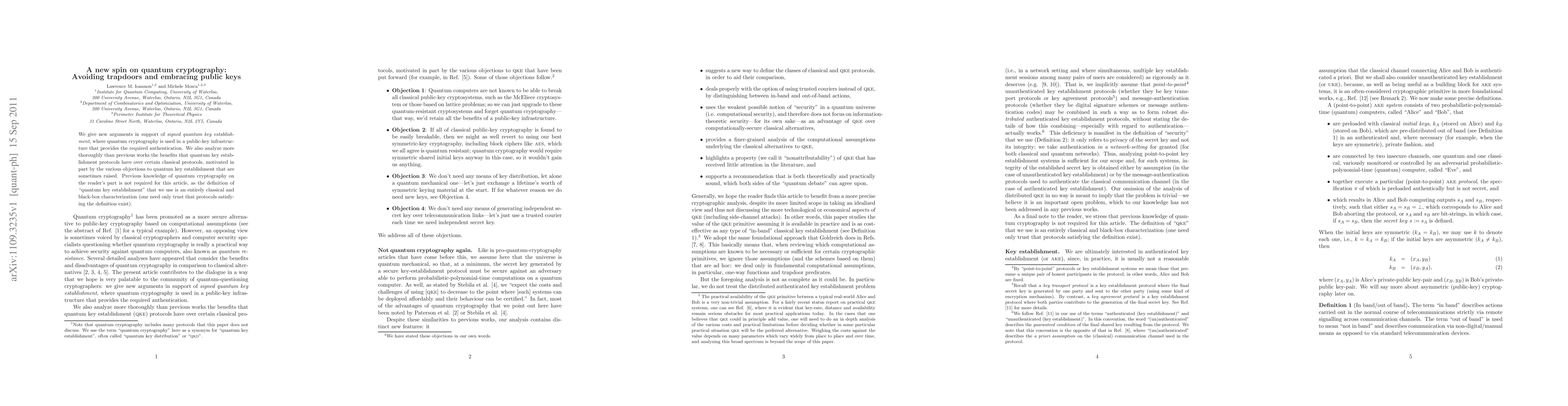 We give new arguments in support of \emph{signed quantum key establishment}, where quantum cryptography is used in a public-key infrastructure that provides the required authentication. We also analyze more thoroughly than previous works the benefits that quantum key establishment protocols have over certain classical protocols, motivated in part by the various objections to quantum key establishment that are sometimes raised. Previous knowledge of quantum cryptography on the reader's part is not required for this article, as the definition of "quantum key establishment" that we use is an entirely classical and black-box characterization (one need only trust that protocols satisfying the definition exist).