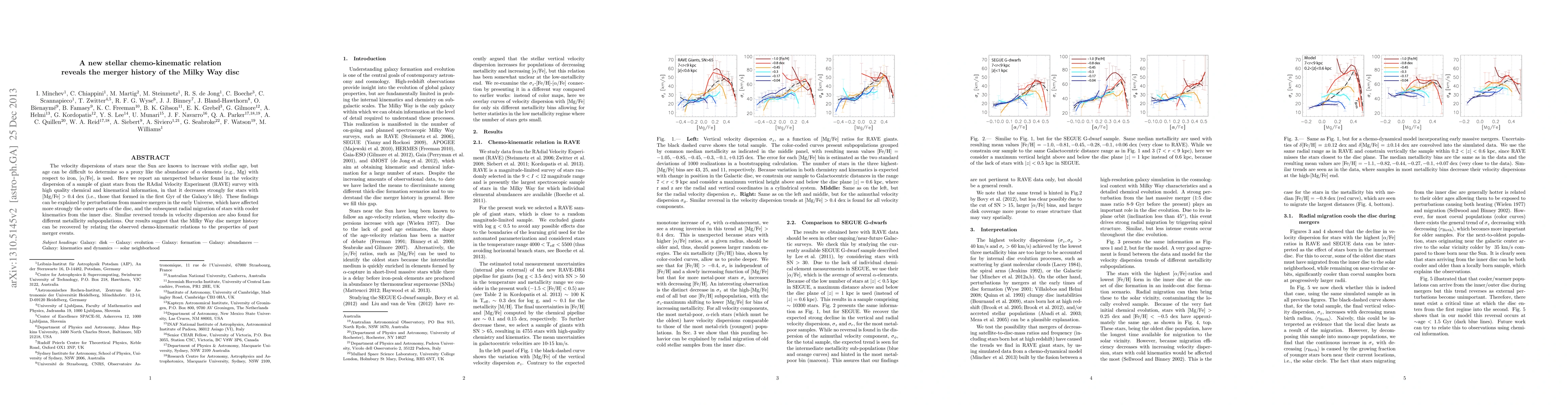 The velocity dispersions of stars near the Sun are known to increase with stellar age, but age can be difficult to determine so a proxy like the abundance of alpha elements (e.g., Mg) with respect to iron, [alpha/Fe], is used. Here we report an unexpected behavior found in the velocity dispersion of a sample of giant stars from the RAdial Velocity Experiment (RAVE) survey with high quality chemical and kinematical information, in that it decreases strongly for stars with [Mg/Fe] > 0.4 dex (i.e., those that formed in the first Gyr of the Galaxy's life). These findings can be explained by perturbations from massive mergers in the early Universe, which have affected more strongly the outer parts of the disc, and the subsequent radial migration of stars with cooler kinematics from the inner disc. Similar reversed trends in velocity dispersion are also found for different metallicity subpopulations. Our results suggest that the Milky Way disc merger history can be recovered by relating the observed chemo-kinematic relations to the properties of past merger events.
