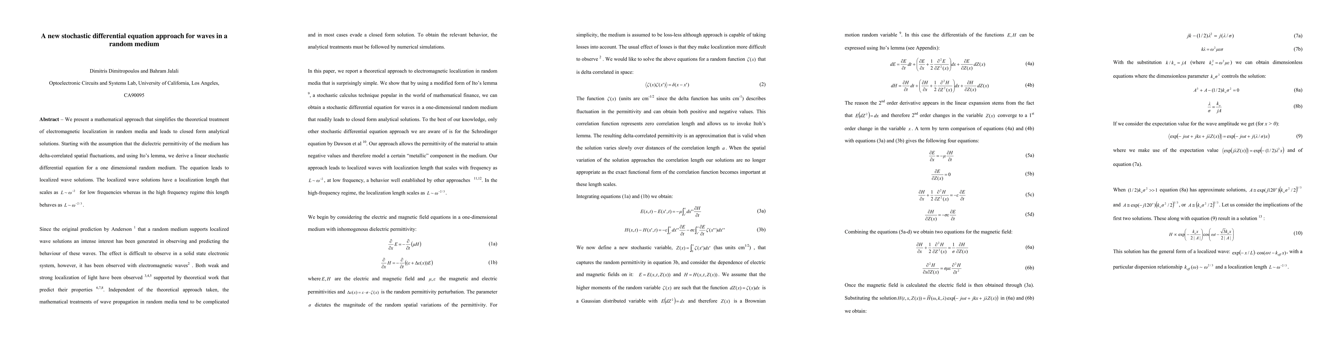 This paper introduces a novel stochastic differential equation method to study electromagnetic waves in random media, yielding closed form analytical solutions. The approach leverages delta-correlated spatial fluctuations in dielectric permittivity and reveals that wave localization length scales inversely with frequency differently in low and high frequency regimes.