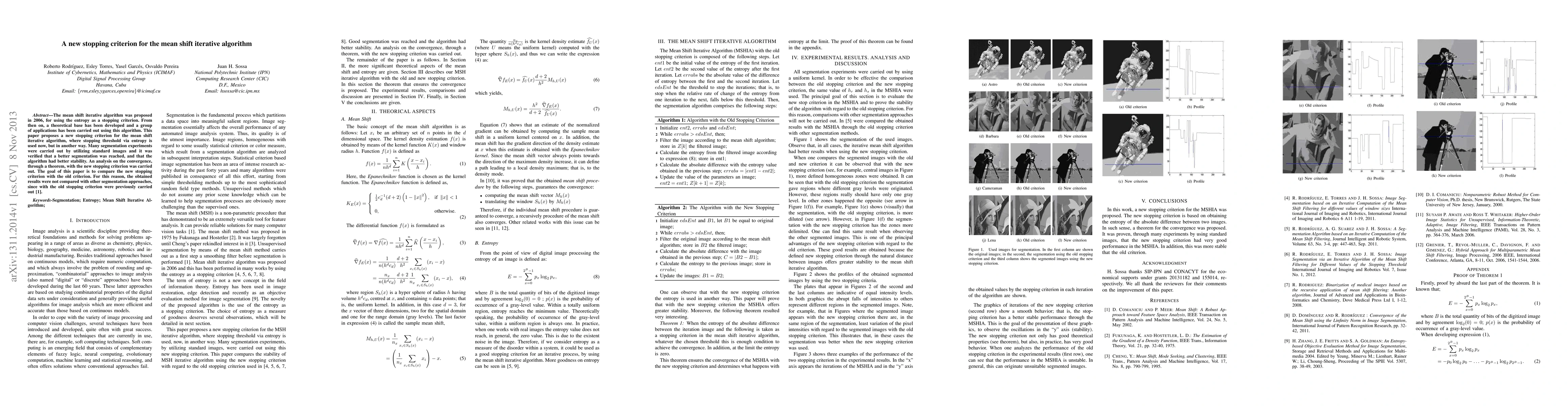 The mean shift iterative algorithm was proposed in 2006, for using the entropy as a stopping criterion. From then on, a theoretical base has been developed and a group of applications has been carried out using this algorithm. This paper proposes a new stopping criterion for the mean shift iterative algorithm, where stopping threshold via entropy is used now, but in another way. Many segmentation experiments were carried out by utilizing standard images and it was verified that a better segmentation was reached, and that the algorithm had better stability. An analysis on the convergence, through a theorem, with the new stopping criterion was carried out. The goal of this paper is to compare the new stopping criterion with the old criterion. For this reason, the obtained results were not compared with other segmentation approaches, since with the old stopping criterion were previously carried out.