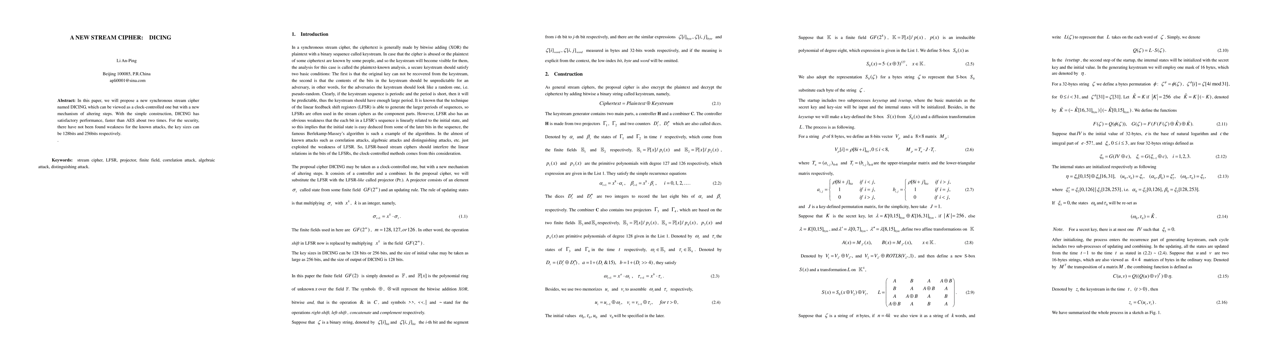 Summary: This paper introduces DICING, a new synchronous stream cipher with a unique clock-controlled mechanism for altering steps. It demonstrates satisfactory performance and has shown resilience against known attacks, supporting key sizes of 128 and 256 bits.