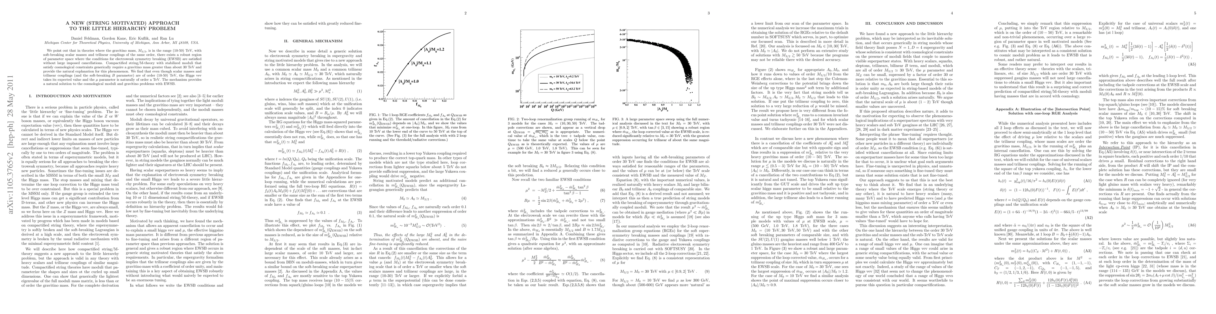 We point out that in theories where the gravitino mass, $M_{3/2}$, is in the range (10-50)TeV, with soft-breaking scalar masses and trilinear couplings of the same order, there exists a robust region of parameter space where the conditions for electroweak symmetry breaking (EWSB) are satisfied without large imposed cancellations. Compactified string/M-theory with stabilized moduli that satisfy cosmological constraints generically require a gravitino mass greater than about 30 TeV and provide the natural explanation for this phenomenon. We find that even though scalar masses and trilinear couplings (and the soft-breaking $B$ parameter) are of order (10-50)TeV, the Higgs vev takes its expected value and the $\mu$ parameter is naturally of order a TeV. The mechanism provides a natural solution to the cosmological moduli and gravitino problems with EWSB.